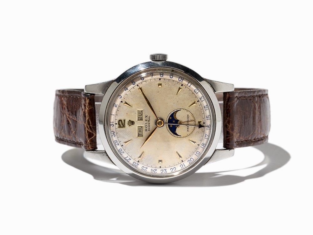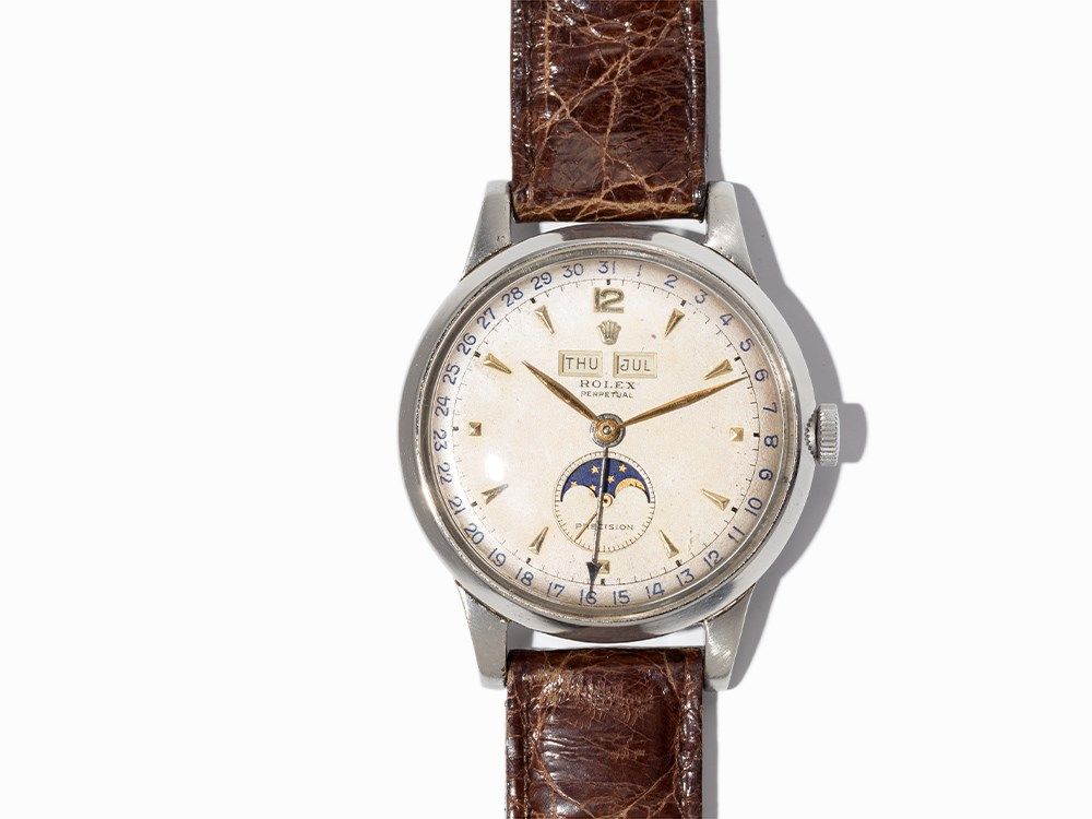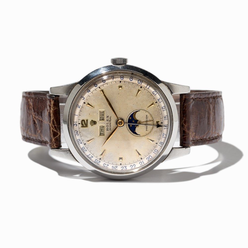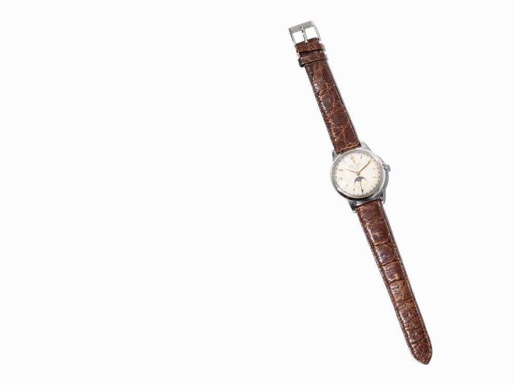 This Rolex Padellone Perpetual, ref. 8171, was made in Switzerland around 1950. The watch is fitted with an automatic movement calibre 10’’’ with 17 jewels and displays hour, minute, small second, week day, month, moon phase and date. The silver dial shows gold and brass hands. The watch case is made of stainless steel. The watch has a brown leather strap with pin buckle of stainless steel. The watch case number is 636263.
