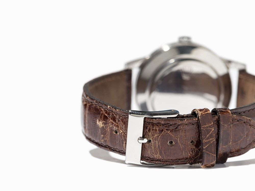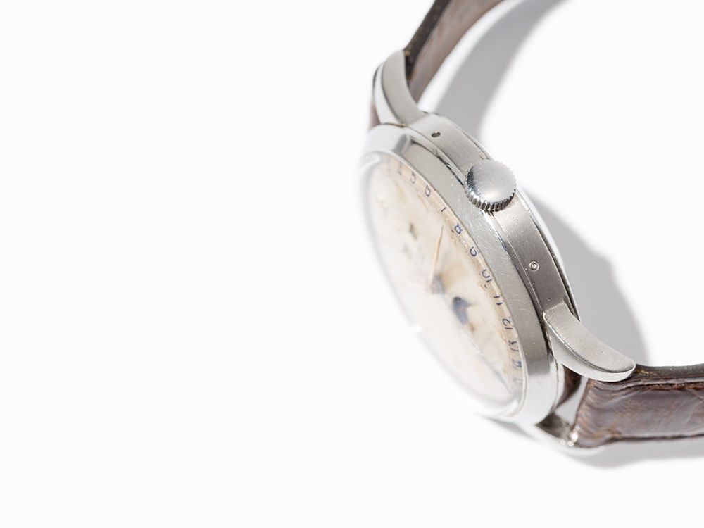 The watch case measures 38 mm in diameter and 13 mm in height. The strap is 22 cm long. The watch weighs 61 grams. The timepiece is in good, age-related condition with traces of wear. During in house testing the watch was fully functional. Long-term precision and regularity cannot be guaranteed. The dial has a light patina.