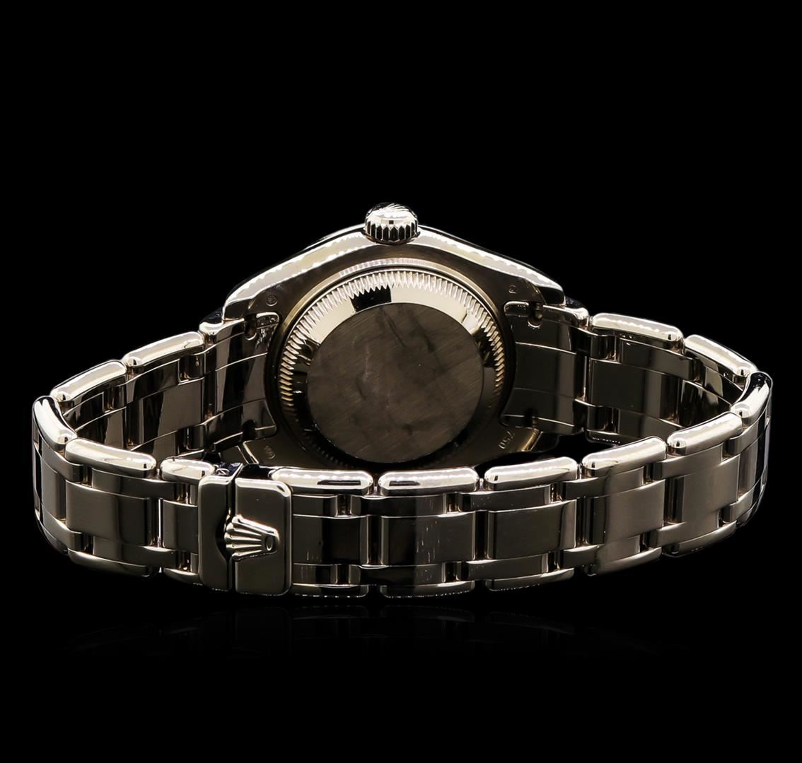 One ladies, hand crafted & machine milled Rolex Masterpiece DateJust, model wristwatch electronically tested 18KT White gold, Swiss & Rolex Hallmarked Case: 29mm oyster, Water resistant: 100 meters / 330 feet. Scalloped Rolex logo'd Crown: twinlock, double water proof system, Custom Bezel: diamond set, Rolex Hallmarked Crystal: synthetic sapphire cyclops lens. Circa 2001. Movement: superlative chronometer automatic. Rolex signed Dial: light mother of pearl, with baton hands and raised diamond markers, Date Window: 3 o'clock position, quick set, Date Wheel: White color, Rolex Bracelet: 18KT White gold Pearlmaster links, Condition: G-6 Extra Fine. Bright polish finish. Six and three quarter inch length. Swiss Hallmarked Rolex concealed deployment clasp, with logo. Containing: Thirty Two round brilliant cut diamonds, estimated total weight equals 1.44ct. Set & graded in the custom bezel. Clarity VVS-2 to VS-2. Color: F - H. Total Weight of Diamonds 1.44ct. Total Weight of Watch 106.72gm. AIG Appraised at $36,000.00.