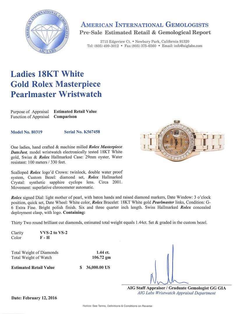One ladies, hand crafted & machine milled Rolex Masterpiece DateJust, model wristwatch electronically tested 18KT White gold, Swiss & Rolex Hallmarked Case: 29mm oyster, Water resistant: 100 meters / 330 feet. Scalloped Rolex logo'd Crown: twinlock, double water proof system, Custom Bezel: diamond set, Rolex Hallmarked Crystal: synthetic sapphire cyclops lens. Circa 2001. Movement: superlative chronometer automatic. Rolex signed Dial: light mother of pearl, with baton hands and raised diamond markers, Date Window: 3 o'clock position, quick set, Date Wheel: White color, Rolex Bracelet: 18KT White gold Pearlmaster links, Condition: G-6 Extra Fine. Bright polish finish. Six and three quarter inch length. Swiss Hallmarked Rolex concealed deployment clasp, with logo. Containing: Thirty Two round brilliant cut diamonds, estimated total weight equals 1.44ct. Set & graded in the custom bezel. Clarity VVS-2 to VS-2. Color: F - H. Total Weight of Diamonds 1.44ct. Total Weight of Watch 106.72gm. AIG Appraised at $36,000.00.
