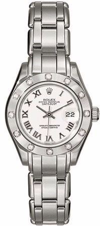 Model: 80318-WHRO - CASE = [Material:18kt White Gold], [Case Diameter:29], [Bezel:Fixed Diamond], [Water Resistant:100 Meters - 330 Feet], [Crystal:Sapphire],; DIAL = [Color:White Roman Numeral],; MOVEMENT = [Type:31 Jewel Automatic Self Winding],; BAND = [Type:18kt White Gold], (Usually ships in 1 to 2 weeks.)