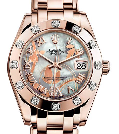 Model: 81315-WHGDRP - CASE = [Material:18kt Rose Gold], [Case Diameter:34], [Water Resistant:100 Meters - 330 Feet], [Crystal:Scratch Resistant Sapphire], DIAL = [Color:White Goldust Dream with Rose Gold Hands and Roman Numerals], MOVEMENT = [Type:Automatic Self Winding], [Crown:Screw Down], BAND = [Clasp:Folding], [Type:18kt Rose Gold], (Usually ships in 1 to 2 weeks.)