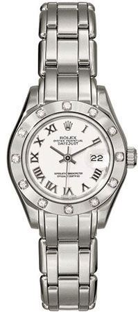 Model: 80318-WHRO - CASE = [Material:18kt White Gold], [Case Diameter:29], [Bezel:Fixed Diamond], [Water Resistant:100 Meters - 330 Feet], [Crystal:Sapphire], DIAL = [Color:White Roman Numeral], MOVEMENT = [Type:31 Jewel Automatic Self Winding], BAND = [Type:18kt White Gold], (Usually ships in 1 to 2 weeks.)