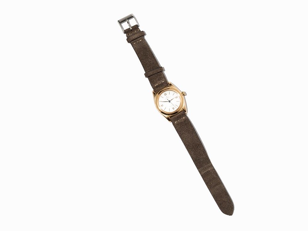 This Rolex perpetual chronometer, ref. 3131, was made in Switzerland around 1945. The watch is fitted with an automatic movement calibre 9 ¾’’’ with 18 jewels and displays hour, minute and second. The silver dial shows gold and blued hands. The watch case is made of 18K red gold. The watch has a grey leather strap with pin buckle.
