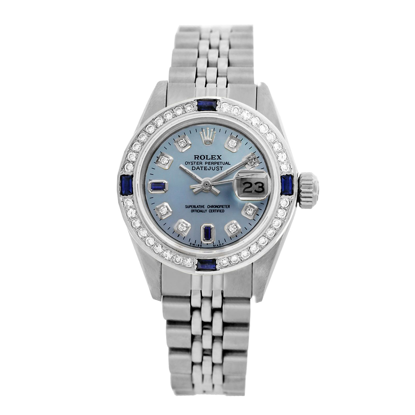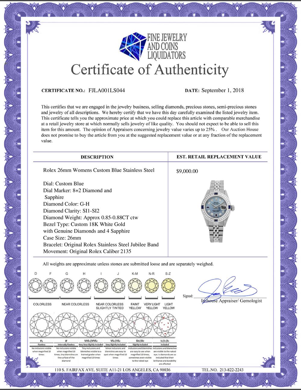 Bezel Type: Custom 18K White Gold with Genuine Diamonds and 4 Sapphire Baguette