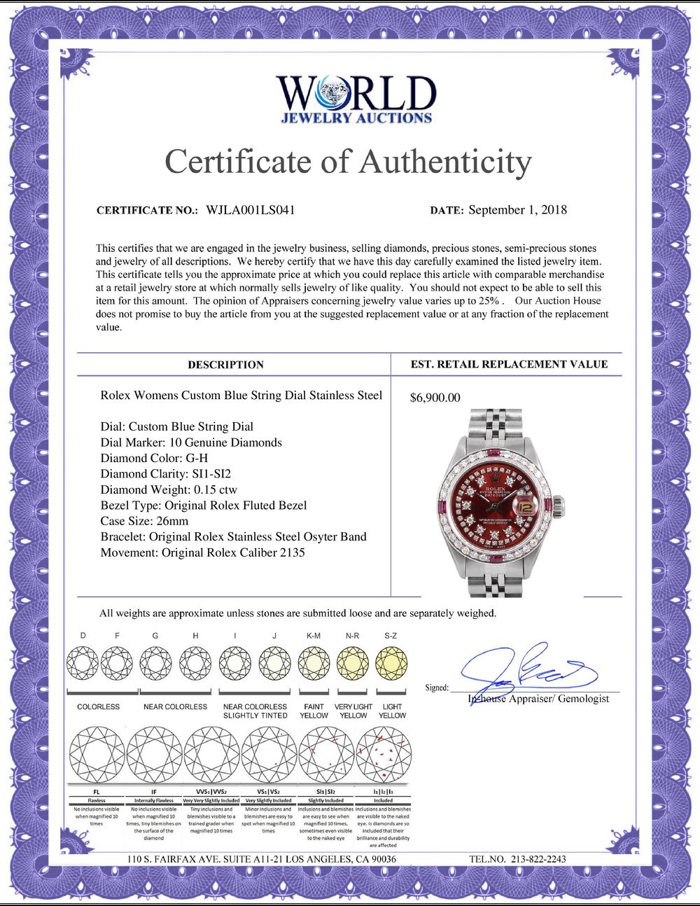 WORLD JEWELRY AUCTION believes to the best of its knowledge that the information presented in any listing has come from reliable sources. Such information is presented solely for the convenience of the Purchaser. WJA makes no warranties of any kind related to the information presented in any listing. WJA further makes no warranties, either express or implied, relating to the value, marketability or condition of the lot described in any listing. Prospective bidders should investigate a lot thoroughly before bidding. By bidding the Bidder acknowledges that Bidder has investigated the lot to his or her satisfaction, or, that Bidder has chosen not to do so, and agrees to accept the lot being bid on with no objections after the sale closes. If you are uncertain please contact us with your questions prior to bidding. If you are still uncertain after we reply, please refrain from bidding. Photos other graphic material contained in any listing of generic or duplicate lots may be stock presentations and not necessarily of the specific lot.