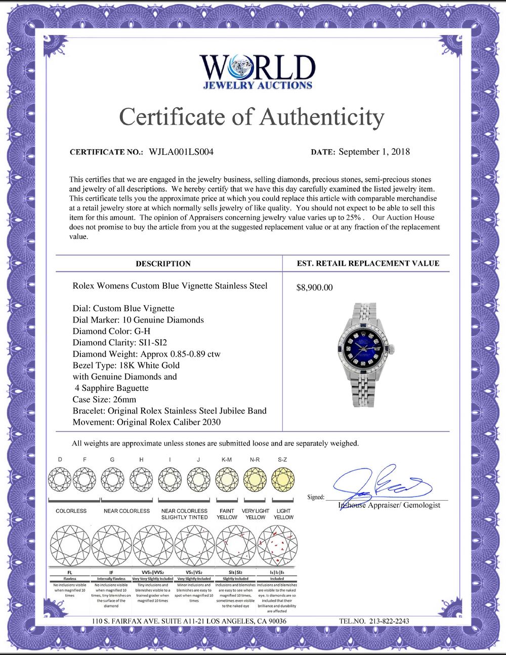 WORLD JEWELRY AUCTION believes to the best of its knowledge that the information presented in any listing has come from reliable sources. Such information is presented solely for the convenience of the Purchaser. WJA makes no warranties of any kind related to the information presented in any listing. WJA further makes no warranties, either express or implied, relating to the value, marketability or condition of the lot described in any listing. Prospective bidders should investigate a lot thoroughly before bidding. By bidding the Bidder acknowledges that Bidder has investigated the lot to his or her satisfaction, or, that Bidder has chosen not to do so, and agrees to accept the lot being bid on with no objections after the sale closes. If you are uncertain please contact us with your questions prior to bidding. If you are still uncertain after we reply, please refrain from bidding. Photos other graphic material contained in any listing of generic or duplicate lots may be stock presentations and not necessarily of the specific lot.