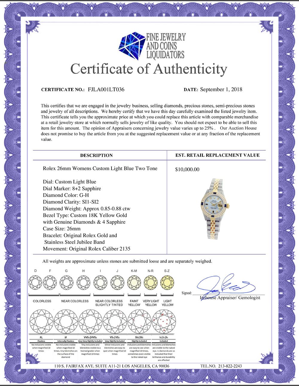 WORLD JEWELRY AUCTION believes to the best of its knowledge that the information presented in any listing has come from reliable sources. Such information is presented solely for the convenience of the Purchaser. WJA makes no warranties of any kind related to the information presented in any listing. WJA further makes no warranties, either express or implied, relating to the value, marketability or condition of the lot described in any listing. Prospective bidders should investigate a lot thoroughly before bidding. By bidding the Bidder acknowledges that Bidder has investigated the lot to his or her satisfaction, or, that Bidder has chosen not to do so, and agrees to accept the lot being bid on with no objections after the sale closes. If you are uncertain please contact us with your questions prior to bidding. If you are still uncertain after we reply, please refrain from bidding. Photos other graphic material contained in any listing of generic or duplicate lots may be stock presentations and not necessarily of the specific lot.