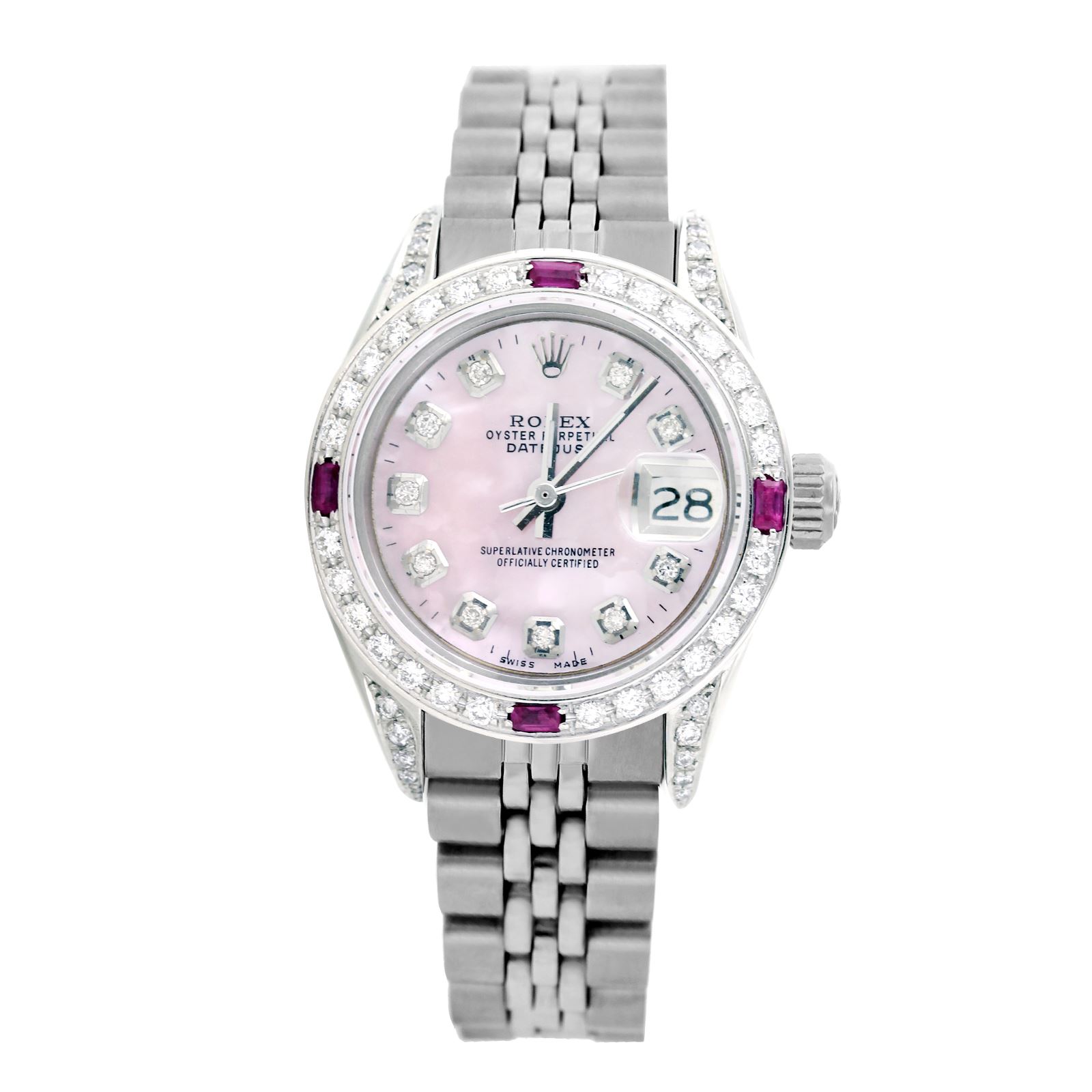 Bezel Type: 18K White Gold with Genuine Diamonds and 4 Ruby Baguette with diamond lug