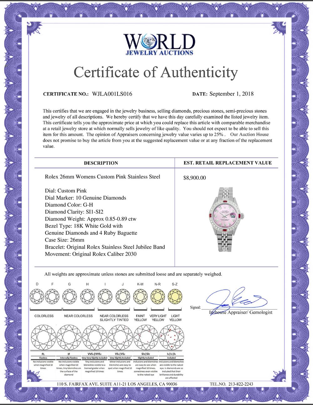 WORLD JEWELRY AUCTION believes to the best of its knowledge that the information presented in any listing has come from reliable sources. Such information is presented solely for the convenience of the Purchaser. WJA makes no warranties of any kind related to the information presented in any listing. WJA further makes no warranties, either express or implied, relating to the value, marketability or condition of the lot described in any listing. Prospective bidders should investigate a lot thoroughly before bidding. By bidding the Bidder acknowledges that Bidder has investigated the lot to his or her satisfaction, or, that Bidder has chosen not to do so, and agrees to accept the lot being bid on with no objections after the sale closes. If you are uncertain please contact us with your questions prior to bidding. If you are still uncertain after we reply, please refrain from bidding. Photos other graphic material contained in any listing of generic or duplicate lots may be stock presentations and not necessarily of the specific lot.