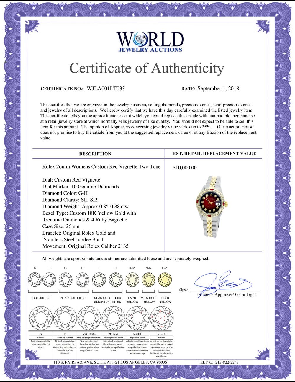 WORLD JEWELRY AUCTION believes to the best of its knowledge that the information presented in any listing has come from reliable sources. Such information is presented solely for the convenience of the Purchaser. WJA makes no warranties of any kind related to the information presented in any listing. WJA further makes no warranties, either express or implied, relating to the value, marketability or condition of the lot described in any listing. Prospective bidders should investigate a lot thoroughly before bidding. By bidding the Bidder acknowledges that Bidder has investigated the lot to his or her satisfaction, or, that Bidder has chosen not to do so, and agrees to accept the lot being bid on with no objections after the sale closes. If you are uncertain please contact us with your questions prior to bidding. If you are still uncertain after we reply, please refrain from bidding. Photos other graphic material contained in any listing of generic or duplicate lots may be stock presentations and not necessarily of the specific lot.