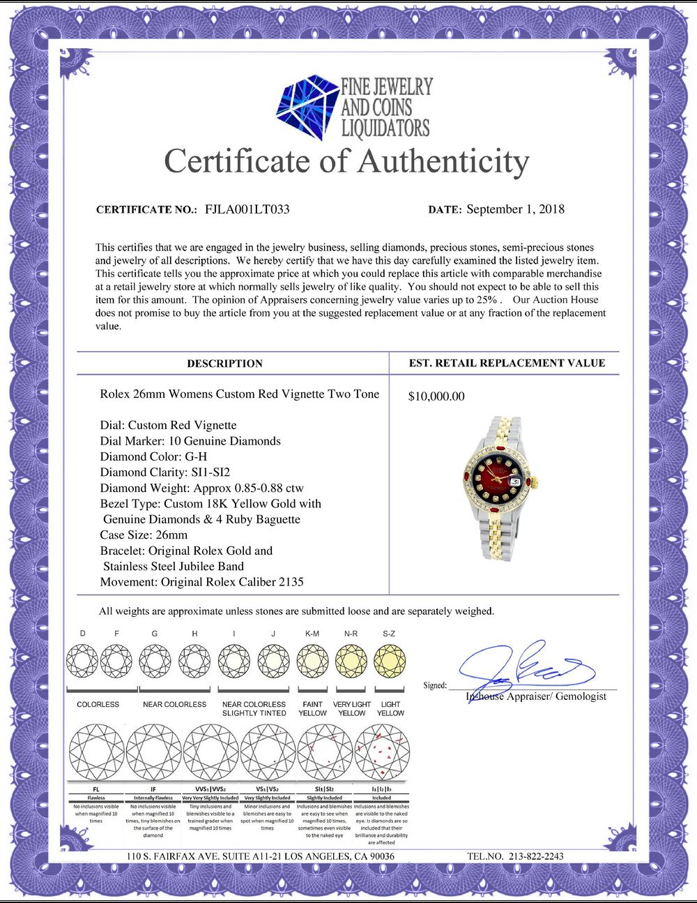 WORLD JEWELRY AUCTION believes to the best of its knowledge that the information presented in any listing has come from reliable sources. Such information is presented solely for the convenience of the Purchaser. WJA makes no warranties of any kind related to the information presented in any listing. WJA further makes no warranties, either express or implied, relating to the value, marketability or condition of the lot described in any listing. Prospective bidders should investigate a lot thoroughly before bidding. By bidding the Bidder acknowledges that Bidder has investigated the lot to his or her satisfaction, or, that Bidder has chosen not to do so, and agrees to accept the lot being bid on with no objections after the sale closes. If you are uncertain please contact us with your questions prior to bidding. If you are still uncertain after we reply, please refrain from bidding. Photos other graphic material contained in any listing of generic or duplicate lots may be stock presentations and not necessarily of the specific lot.