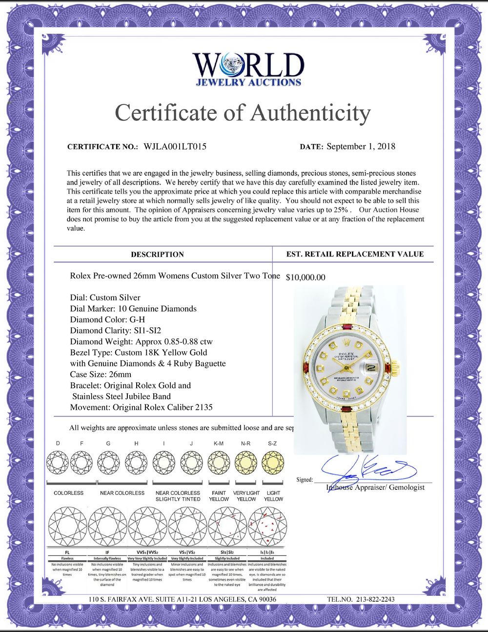 WORLD JEWELRY AUCTION believes to the best of its knowledge that the information presented in any listing has come from reliable sources. Such information is presented solely for the convenience of the Purchaser. WJA makes no warranties of any kind related to the information presented in any listing. WJA further makes no warranties, either express or implied, relating to the value, marketability or condition of the lot described in any listing. Prospective bidders should investigate a lot thoroughly before bidding. By bidding the Bidder acknowledges that Bidder has investigated the lot to his or her satisfaction, or, that Bidder has chosen not to do so, and agrees to accept the lot being bid on with no objections after the sale closes. If you are uncertain please contact us with your questions prior to bidding. If you are still uncertain after we reply, please refrain from bidding. Photos other graphic material contained in any listing of generic or duplicate lots may be stock presentations and not necessarily of the specific lot.