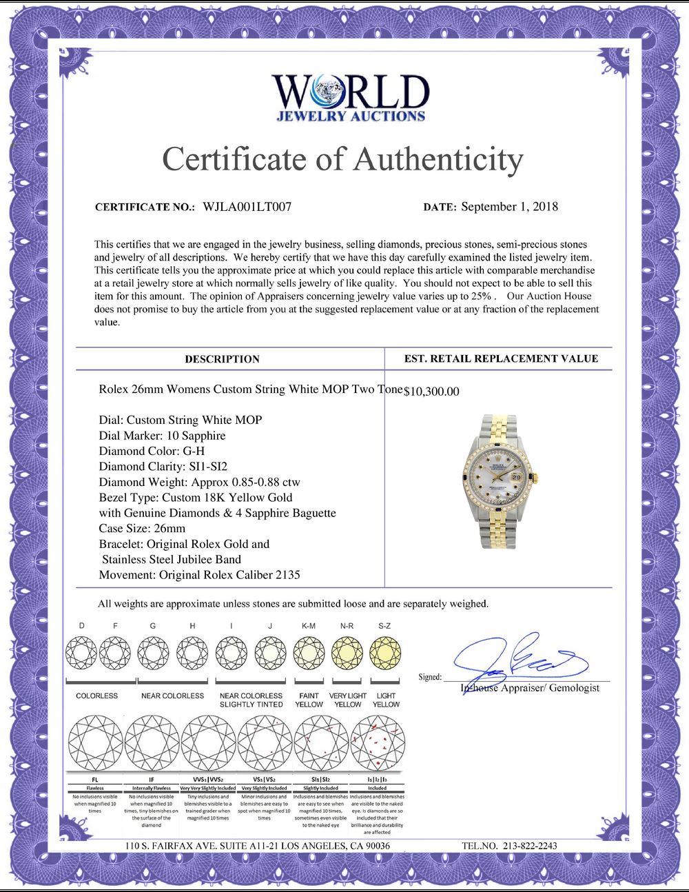 WORLD JEWELRY AUCTION believes to the best of its knowledge that the information presented in any listing has come from reliable sources. Such information is presented solely for the convenience of the Purchaser. WJA makes no warranties of any kind related to the information presented in any listing. WJA further makes no warranties, either express or implied, relating to the value, marketability or condition of the lot described in any listing. Prospective bidders should investigate a lot thoroughly before bidding. By bidding the Bidder acknowledges that Bidder has investigated the lot to his or her satisfaction, or, that Bidder has chosen not to do so, and agrees to accept the lot being bid on with no objections after the sale closes. If you are uncertain please contact us with your questions prior to bidding. If you are still uncertain after we reply, please refrain from bidding. Photos other graphic material contained in any listing of generic or duplicate lots may be stock presentations and not necessarily of the specific lot.