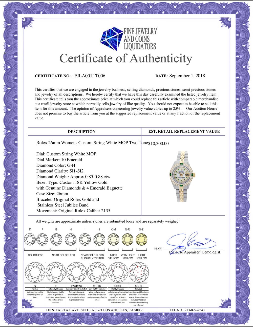 WORLD JEWELRY AUCTION believes to the best of its knowledge that the information presented in any listing has come from reliable sources. Such information is presented solely for the convenience of the Purchaser. WJA makes no warranties of any kind related to the information presented in any listing. WJA further makes no warranties, either express or implied, relating to the value, marketability or condition of the lot described in any listing. Prospective bidders should investigate a lot thoroughly before bidding. By bidding the Bidder acknowledges that Bidder has investigated the lot to his or her satisfaction, or, that Bidder has chosen not to do so, and agrees to accept the lot being bid on with no objections after the sale closes. If you are uncertain please contact us with your questions prior to bidding. If you are still uncertain after we reply, please refrain from bidding. Photos other graphic material contained in any listing of generic or duplicate lots may be stock presentations and not necessarily of the specific lot.