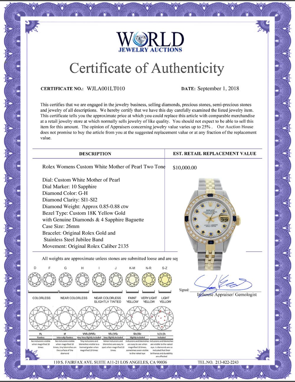 WORLD JEWELRY AUCTION believes to the best of its knowledge that the information presented in any listing has come from reliable sources. Such information is presented solely for the convenience of the Purchaser. WJA makes no warranties of any kind related to the information presented in any listing. WJA further makes no warranties, either express or implied, relating to the value, marketability or condition of the lot described in any listing. Prospective bidders should investigate a lot thoroughly before bidding. By bidding the Bidder acknowledges that Bidder has investigated the lot to his or her satisfaction, or, that Bidder has chosen not to do so, and agrees to accept the lot being bid on with no objections after the sale closes. If you are uncertain please contact us with your questions prior to bidding. If you are still uncertain after we reply, please refrain from bidding. Photos other graphic material contained in any listing of generic or duplicate lots may be stock presentations and not necessarily of the specific lot.