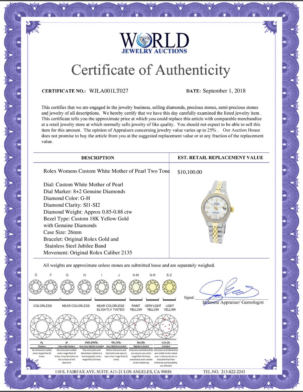 WORLD JEWELRY AUCTION believes to the best of its knowledge that the information presented in any listing has come from reliable sources. Such information is presented solely for the convenience of the Purchaser. WJA makes no warranties of any kind related to the information presented in any listing. WJA further makes no warranties, either express or implied, relating to the value, marketability or condition of the lot described in any listing. Prospective bidders should investigate a lot thoroughly before bidding. By bidding the Bidder acknowledges that Bidder has investigated the lot to his or her satisfaction, or, that Bidder has chosen not to do so, and agrees to accept the lot being bid on with no objections after the sale closes. If you are uncertain please contact us with your questions prior to bidding. If you are still uncertain after we reply, please refrain from bidding. Photos other graphic material contained in any listing of generic or duplicate lots may be stock presentations and not necessarily of the specific lot.