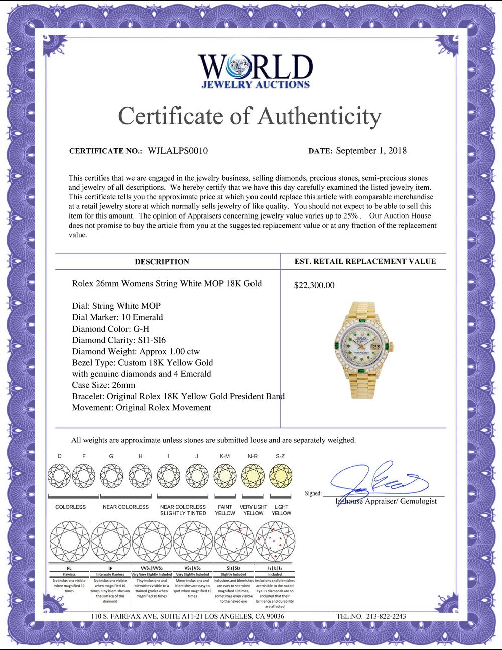 WORLD JEWELRY AUCTION believes to the best of its knowledge that the information presented in any listing has come from reliable sources. Such information is presented solely for the convenience of the Purchaser. WJA makes no warranties of any kind related to the information presented in any listing. WJA further makes no warranties, either express or implied, relating to the value, marketability or condition of the lot described in any listing. Prospective bidders should investigate a lot thoroughly before bidding. By bidding the Bidder acknowledges that Bidder has investigated the lot to his or her satisfaction, or, that Bidder has chosen not to do so, and agrees to accept the lot being bid on with no objections after the sale closes. If you are uncertain please contact us with your questions prior to bidding. If you are still uncertain after we reply, please refrain from bidding. Photos other graphic material contained in any listing of generic or duplicate lots may be stock presentations and not necessarily of the specific lot.