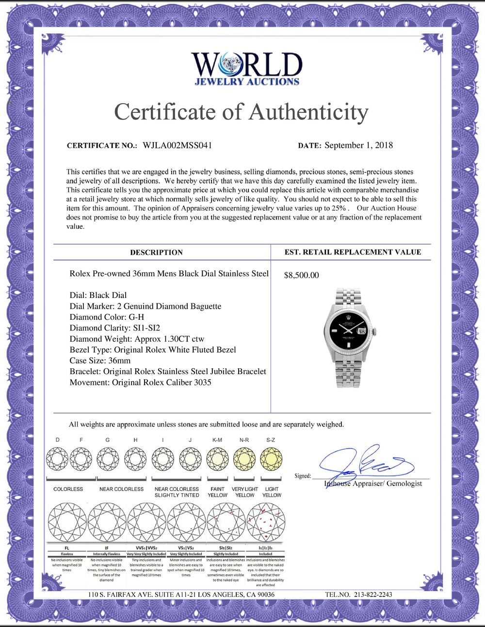 WORLD JEWELRY AUCTION believes to the best of its knowledge that the information presented in any listing has come from reliable sources. Such information is presented solely for the convenience of the Purchaser. WJA makes no warranties of any kind related to the information presented in any listing. WJA further makes no warranties, either express or implied, relating to the value, marketability or condition of the lot described in any listing. Prospective bidders should investigate a lot thoroughly before bidding. By bidding the Bidder acknowledges that Bidder has investigated the lot to his or her satisfaction, or, that Bidder has chosen not to do so, and agrees to accept the lot being bid on with no objections after the sale closes. If you are uncertain please contact us with your questions prior to bidding. If you are still uncertain after we reply, please refrain from bidding. Photos other graphic material contained in any listing of generic or duplicate lots may be stock presentations and not necessarily of the specific lot.