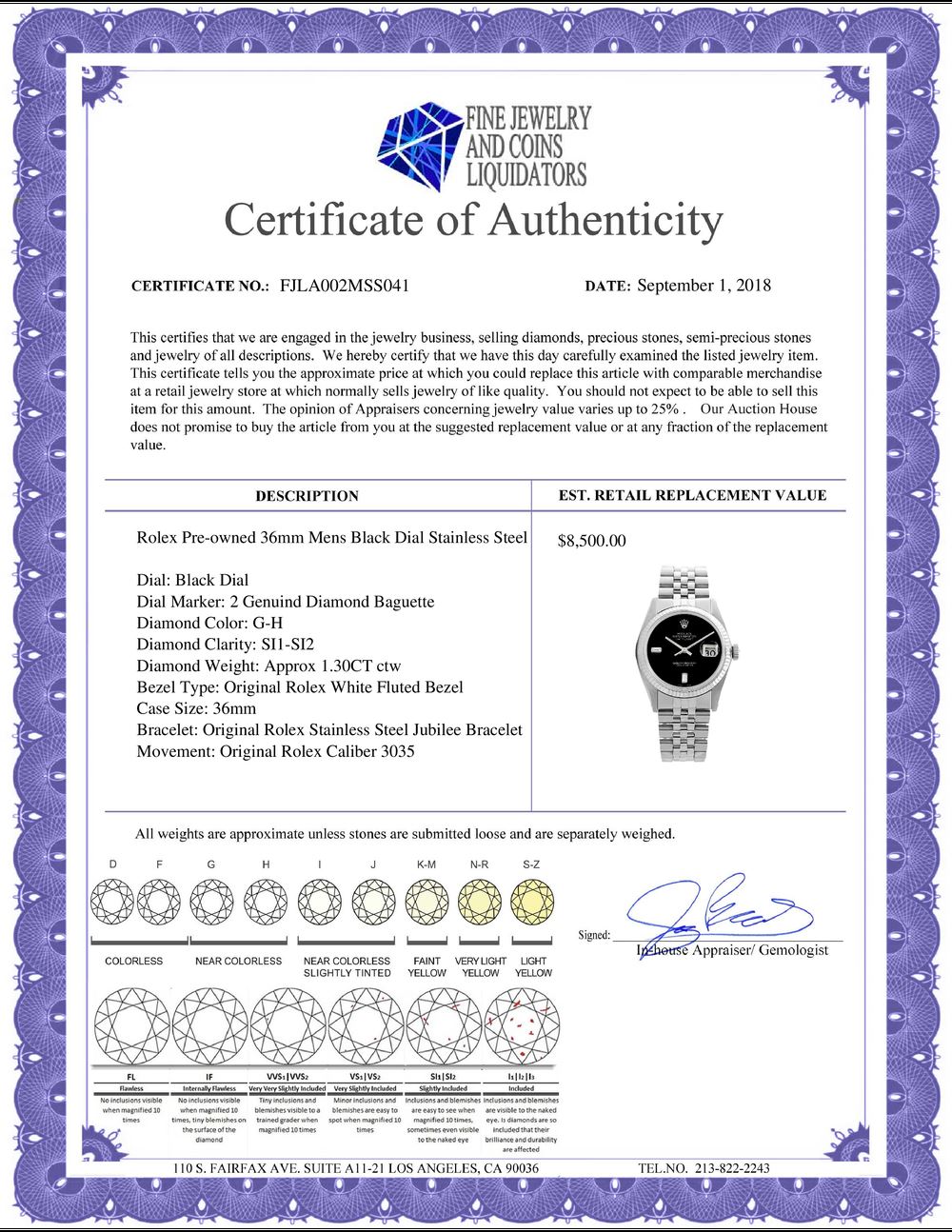 WORLD JEWELRY AUCTION believes to the best of its knowledge that the information presented in any listing has come from reliable sources. Such information is presented solely for the convenience of the Purchaser. WJA makes no warranties of any kind related to the information presented in any listing. WJA further makes no warranties, either express or implied, relating to the value, marketability or condition of the lot described in any listing. Prospective bidders should investigate a lot thoroughly before bidding. By bidding the Bidder acknowledges that Bidder has investigated the lot to his or her satisfaction, or, that Bidder has chosen not to do so, and agrees to accept the lot being bid on with no objections after the sale closes. If you are uncertain please contact us with your questions prior to bidding. If you are still uncertain after we reply, please refrain from bidding. Photos other graphic material contained in any listing of generic or duplicate lots may be stock presentations and not necessarily of the specific lot.
