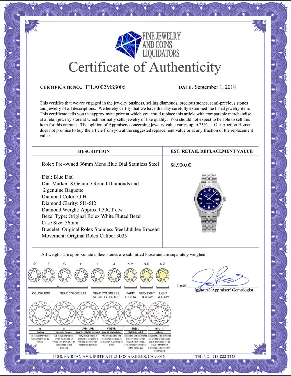 WORLD JEWELRY AUCTION believes to the best of its knowledge that the information presented in any listing has come from reliable sources. Such information is presented solely for the convenience of the Purchaser. WJA makes no warranties of any kind related to the information presented in any listing. WJA further makes no warranties, either express or implied, relating to the value, marketability or condition of the lot described in any listing. Prospective bidders should investigate a lot thoroughly before bidding. By bidding the Bidder acknowledges that Bidder has investigated the lot to his or her satisfaction, or, that Bidder has chosen not to do so, and agrees to accept the lot being bid on with no objections after the sale closes. If you are uncertain please contact us with your questions prior to bidding. If you are still uncertain after we reply, please refrain from bidding. Photos other graphic material contained in any listing of generic or duplicate lots may be stock presentations and not necessarily of the specific lot.