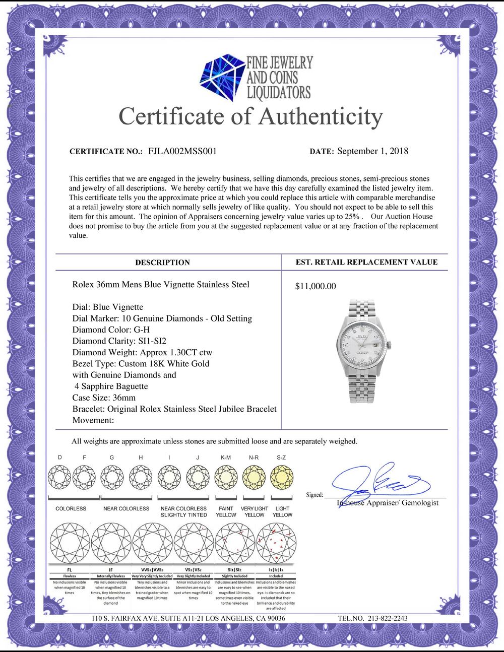 Bezel Type: Custom 18K White Gold with Genuine Diamonds and 4 Sapphire Baguette