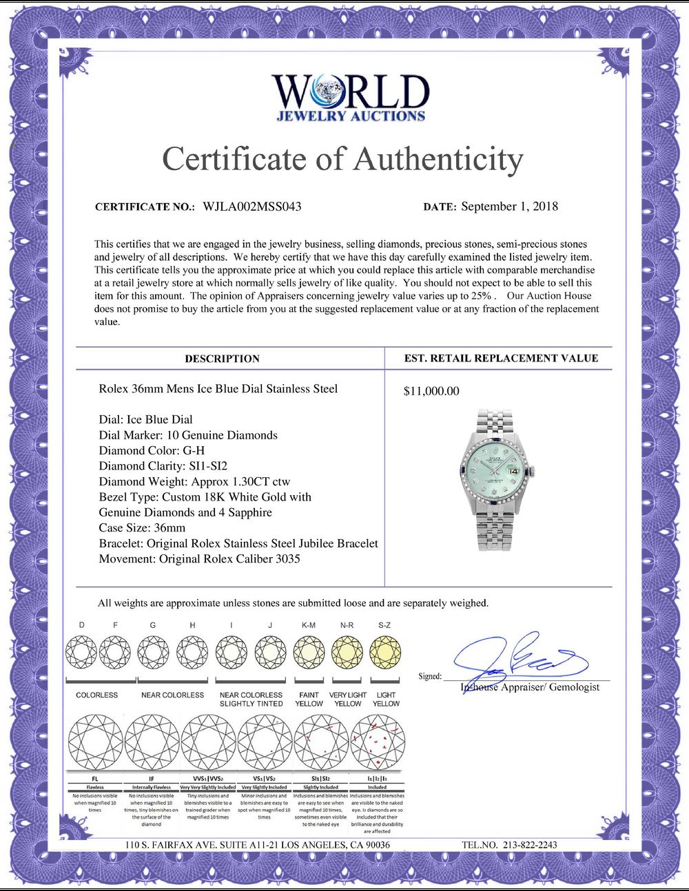 WORLD JEWELRY AUCTION believes to the best of its knowledge that the information presented in any listing has come from reliable sources. Such information is presented solely for the convenience of the Purchaser. WJA makes no warranties of any kind related to the information presented in any listing. WJA further makes no warranties, either express or implied, relating to the value, marketability or condition of the lot described in any listing. Prospective bidders should investigate a lot thoroughly before bidding. By bidding the Bidder acknowledges that Bidder has investigated the lot to his or her satisfaction, or, that Bidder has chosen not to do so, and agrees to accept the lot being bid on with no objections after the sale closes. If you are uncertain please contact us with your questions prior to bidding. If you are still uncertain after we reply, please refrain from bidding. Photos other graphic material contained in any listing of generic or duplicate lots may be stock presentations and not necessarily of the specific lot.