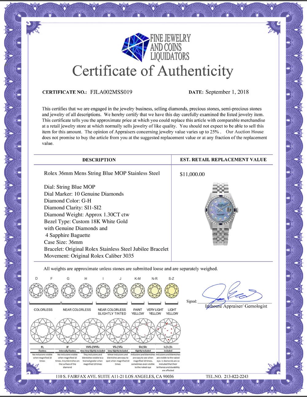 WORLD JEWELRY AUCTION believes to the best of its knowledge that the information presented in any listing has come from reliable sources. Such information is presented solely for the convenience of the Purchaser. WJA makes no warranties of any kind related to the information presented in any listing. WJA further makes no warranties, either express or implied, relating to the value, marketability or condition of the lot described in any listing. Prospective bidders should investigate a lot thoroughly before bidding. By bidding the Bidder acknowledges that Bidder has investigated the lot to his or her satisfaction, or, that Bidder has chosen not to do so, and agrees to accept the lot being bid on with no objections after the sale closes. If you are uncertain please contact us with your questions prior to bidding. If you are still uncertain after we reply, please refrain from bidding. Photos other graphic material contained in any listing of generic or duplicate lots may be stock presentations and not necessarily of the specific lot.