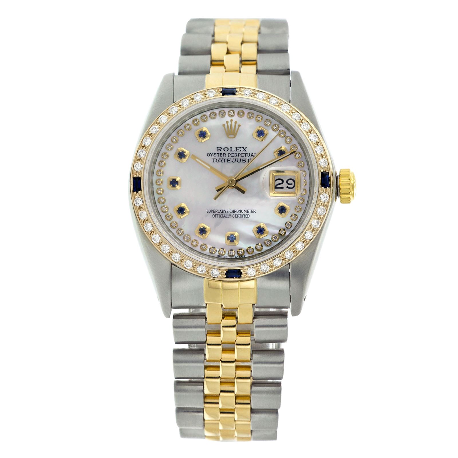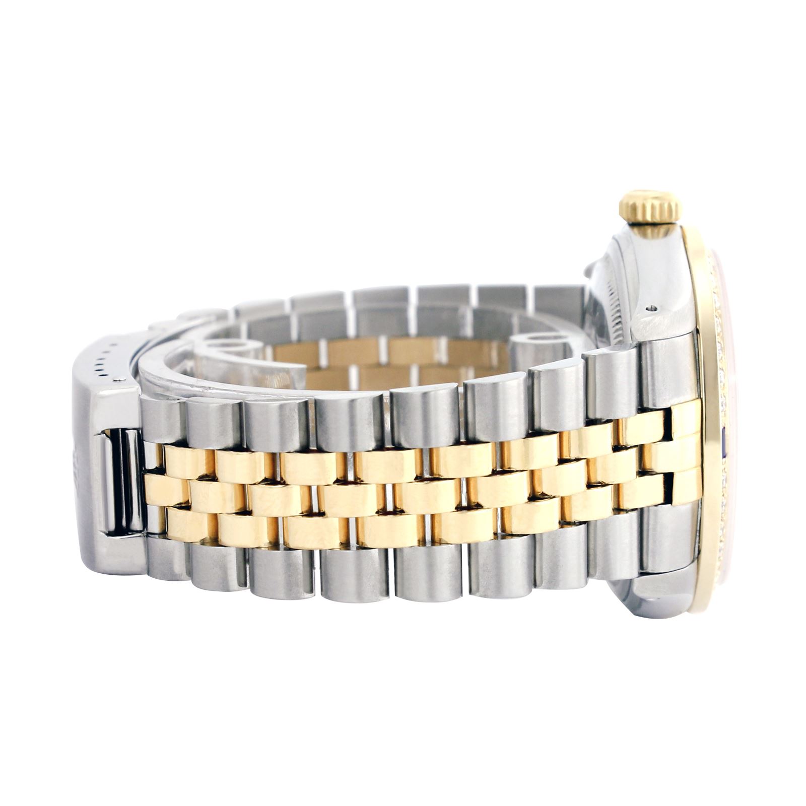 Bezel Type: Custom 18K Yellow Gold with Genuine Diamonds & 4 Sapphire Baguette