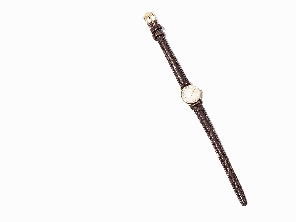 This Rolex Precision women’s watch, ref. 9168, was made in Switzerland around 1955. The watch is fitted with a manual wind movement and displays hour and minute. The beige dial shows gold hands. The watch case is made of 9K gold. The watch has a brown leather strap with pin buckle. The watch case number is 389540.