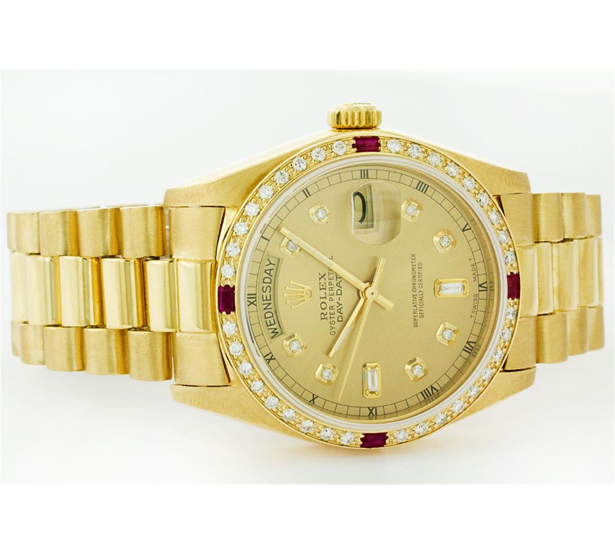One Gents Rolex President Polished, Serviced & Electronically Tested, Yellow Gold Case:36mm, Yellow Gold Crown, Custom Bezel: 18K Yellow Gold Ruby Beadset Diamond Bezel, Diamond + Gem Count: 36 Diamonds + 4 Rubies, Total Weight 1.00 Carat, Clarity: SI-VS, Color: G to H. Custom Crystal: Synthetic Sapphire Cyclops Lens. Movement: Automatic Winding Movement Caliber 3055. Custom Dial: Champagne Diamond Dial With Square Roman Track, Diamond Count: (8 Diamonds In Dial + 2 Baguette Diamonds In Dial) G To H In Color, Clarity: SI-VS. Date Window: 3 O'Clock Position Date Display, Day Window: 12 O'Clock Position Date Display. Quickset, Model: 18038 Condition: G-6 Extra Fine. Bracelet: Yellow Gold President. Bright Polish. 6.5 Inch Length, Standard Hidden Clasp President Clasp, With Rolex Logo.