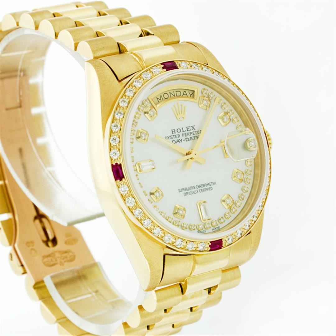 One Gents Rolex President Polished, Serviced & Electronically Tested, Yellow Gold Case:36mm, Yellow Gold Crown, Custom Bezel: 18K Yellow Gold Ruby Beadset Diamond Bezel, Diamond + Gem Count: 36 Diamonds + 4 Rubies, Total Weight 1.00 Carat, Clarity: SI-VS, Color: G to H. Custom Crystal: Synthetic Sapphire Cyclops Lens. Movement: Automatic Winding Movement Caliber 3055. Custom Dial: Mother Of Pearl String Diamond Dial With 2 Baguettes, (49 Diamond In Dial + 2 Baguette Diamonds In Dial) G To H In Color, Clarity: SI-VS. Date Window: 3 O'Clock Position Date Display, Day Window: 12 O'Clock Position Date Display. Quickset, Model: 18038 Condition: G-6 Extra Fine. Bracelet: Yellow Gold President. Bright Polish. 6.5 Inch Length, Standard Hidden Clasp President Clasp, With Rolex Logo. Comes with a six month warranty card.