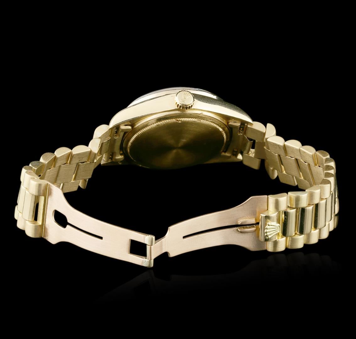 One gents, hand crafted & machine milled Rolex DayDate Model the President wristwatch electronically tested 18KT yellow gold, Case: 35mm oyster, Crown: twin lock with logo, Custom Bezel: diamond set, Custom Crystal: synthetic sapphire cyclops lens. Circa: 1978.Movement: superlative chronometer, Custom Dial: Violet-Blue color, with baton hands, & diamond markers, Calendar: single-quick set, Bracelet: 18KT yellow gold, bright polish & brushed finish, Condition: G-4 Average. Seven and one quarter inch length. Swiss Hallmarked concealed deployment clasp, with logo Containing: Forty Four prong set round brilliant cut diamonds, approximate total weight equals 1.00ct. Set & graded in the bezel. Clarity: SI-2 to I-2. Color: G - I. Total Weight of Diamonds 1.00ct. Total Weight of Watch 119.14gm. AIG Appraised at $22,050.00.