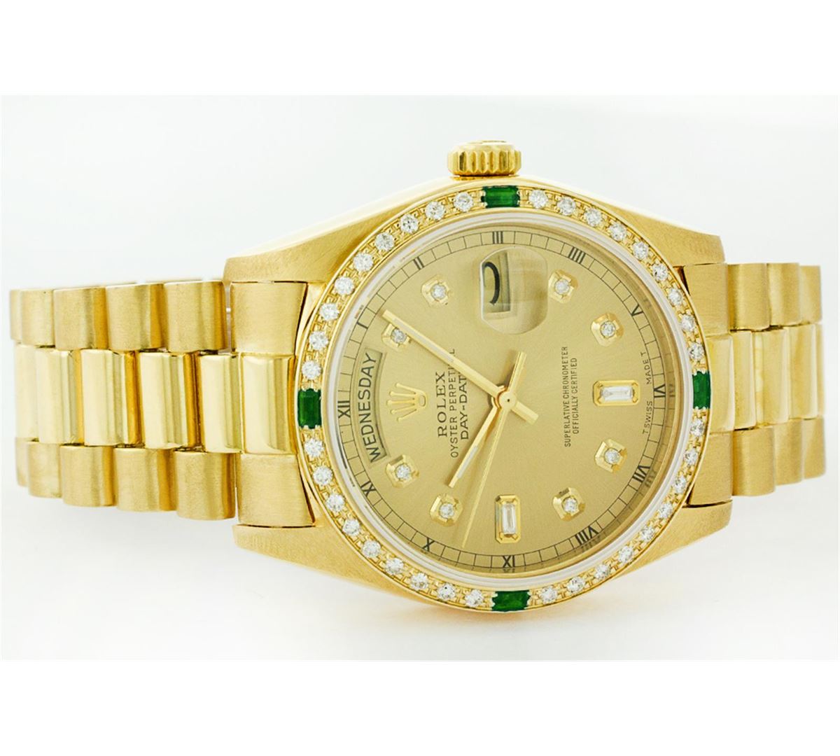 One Gents Rolex President Polished, Serviced & Electronically Tested, Yellow Gold Case:36mm, Yellow Gold Crown, Custom Bezel: 18K Yellow Gold Emerald Beadset Diamond Bezel, Diamond + Gem Count: 36 Diamonds + 4 Emeralds, Total Weight 1.00 Carat, Clarity: SI-VS, Color: G to H. Custom Crystal: Synthetic Sapphire Cyclops Lens. Movement: Automatic Winding Movement Caliber 3055. Custom Dial: Champagne Diamond Dial With Square Roman Track, Diamond Count: (8 Diamonds In Dial + 2 Baguette Diamonds In Dial) G To H In Color, Clarity: SI-VS. Date Window: 3 O'Clock Position Date Display, Day Window: 12 O'Clock Position Date Display. Quickset, Model: 18038 Condition: G-6 Extra Fine. Bracelet: Yellow Gold President. Bright Polish. 6.5 Inch Length, Standard Hidden Clasp President Clasp, With Rolex Logo.