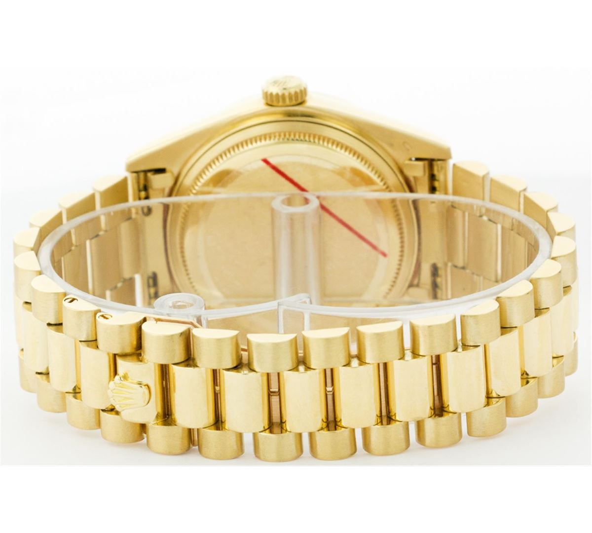 One Gents Rolex President Polished, Serviced & Electronically Tested, Yellow Gold Case:36mm, Yellow Gold Crown, Custom Bezel: 18K Yellow Gold Ruby Beadset Diamond Bezel, Diamond + Gem Count: 36 Diamonds + 4 Rubies, Total Weight 1.00 Carat, Clarity: SI-VS, Color: G to H. Custom Crystal: Synthetic Sapphire Cyclops Lens. Movement: Automatic Winding Movement Caliber 3055. Custom Dial: Mother Of Pearl String Diamond Dial With 2 Baguettes, (49 Diamond In Dial + 2 Baguette Diamonds In Dial) G To H In Color, Clarity: SI-VS. Date Window: 3 O'Clock Position Date Display, Day Window: 12 O'Clock Position Date Display. Quickset, Model: 18038 Condition: G-6 Extra Fine. Bracelet: Yellow Gold President. Bright Polish. 6.5 Inch Length, Standard Hidden Clasp President Clasp, With Rolex Logo. Comes with a six month warranty card.