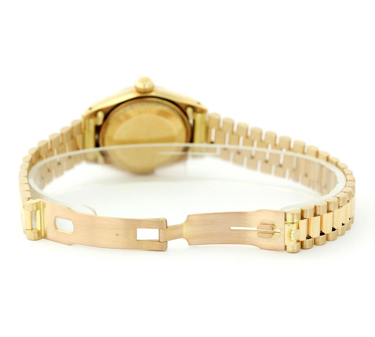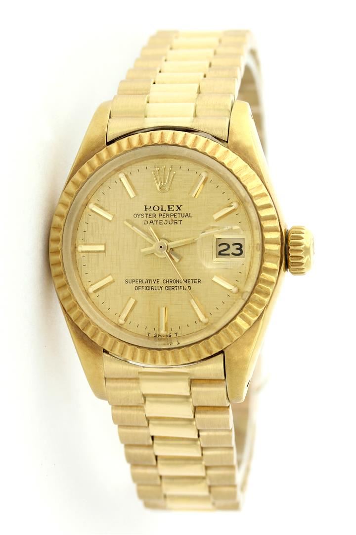One Ladies Rolex President Polished, Serviced & Electronically Tested, Yellow Gold Case: 26mm, Yellow Gold Crown, Custom Bezel: 18K Yellow Gold Fluted Bezel. Custom Crystal: Synthetic Sapphire Cyclops Lens. Movement: Automatic Winding Movement Caliber 2030. Dial: Champagne Index Dial. Date Window: 3 O'Clock Position, Model: 6917 Condition: G-6 Extra Fine. Bracelet: Yellow Gold President, Bright & Satin Polish. 5.5 Inch Length, Standard President Clasp (Hidden Clasp), With Rolex Logo.