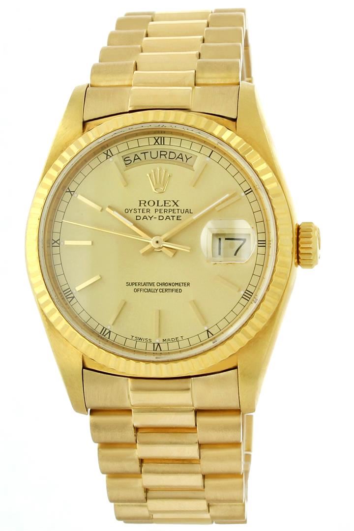 One Gents Rolex DayDate President Polished, Serviced & Electronically Tested, Yellow Gold Case:36mm, Yellow Gold Crown, Bezel: 18K Yellow Gold Fluted Bezel, Crystal: Acrylic Cyclops Lens. Movement: Automatic Winding Movement Caliber 3155. Dial: Champagne With Index Hour Markers, Date Window: 3 O'Clock Position, Day Display: 12 O'Clock Position, Quickset, Model: 18038 Condition: G-6 Extra Fine. Bracelet: Yellow Gold President. Bright Polish. 6.5 Inch Length, Standard President Clasp, With Rolex Logo.