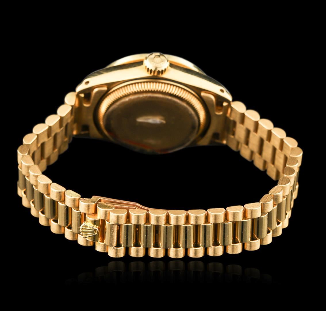 One ladies, hand crafted & machine milled Rolex Lady President the DateJust model wristwatch electronically tested 18KT yellow gold, Circa: 1981, Case: 25mm oyster, Crown: twinlock with logo, Custom Bezel: diamond set, Crystal: acrylic cyclops lens. Movement: superlative chronometer. Dial: Royal Blue, with baton style hands, & diamond markers, Date Display: 3 o'clock position, non quick set, Bracelet: 18KT yellow gold Lady President, Condition: G-4 Average. Bright polish & satin finish. Six inch length. Deployment clasp, with logo. Containing: Forty prong set round brilliant cut diamonds, measuring an average of 1.50mm in diameter, approximate total weight = 0.50ct. Set & graded in the custom bezel. Clarity VS-2 to SI-2. Color: G - H. Total Weight of Diamonds 0.50ct. Total Weight of Watch 67.47 grams. AIG Appraised at $20,350.00.