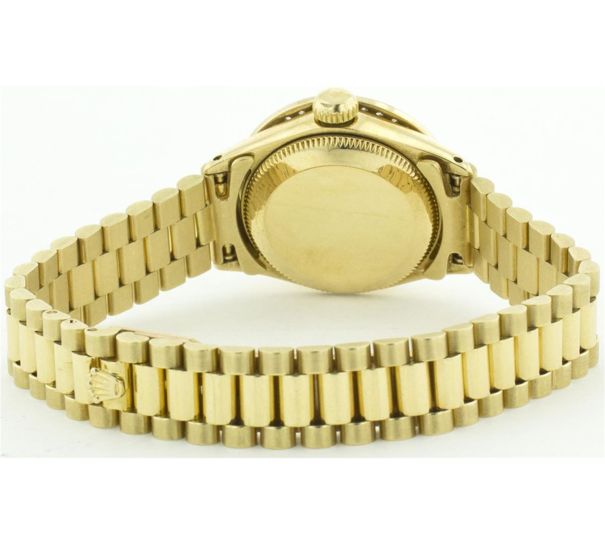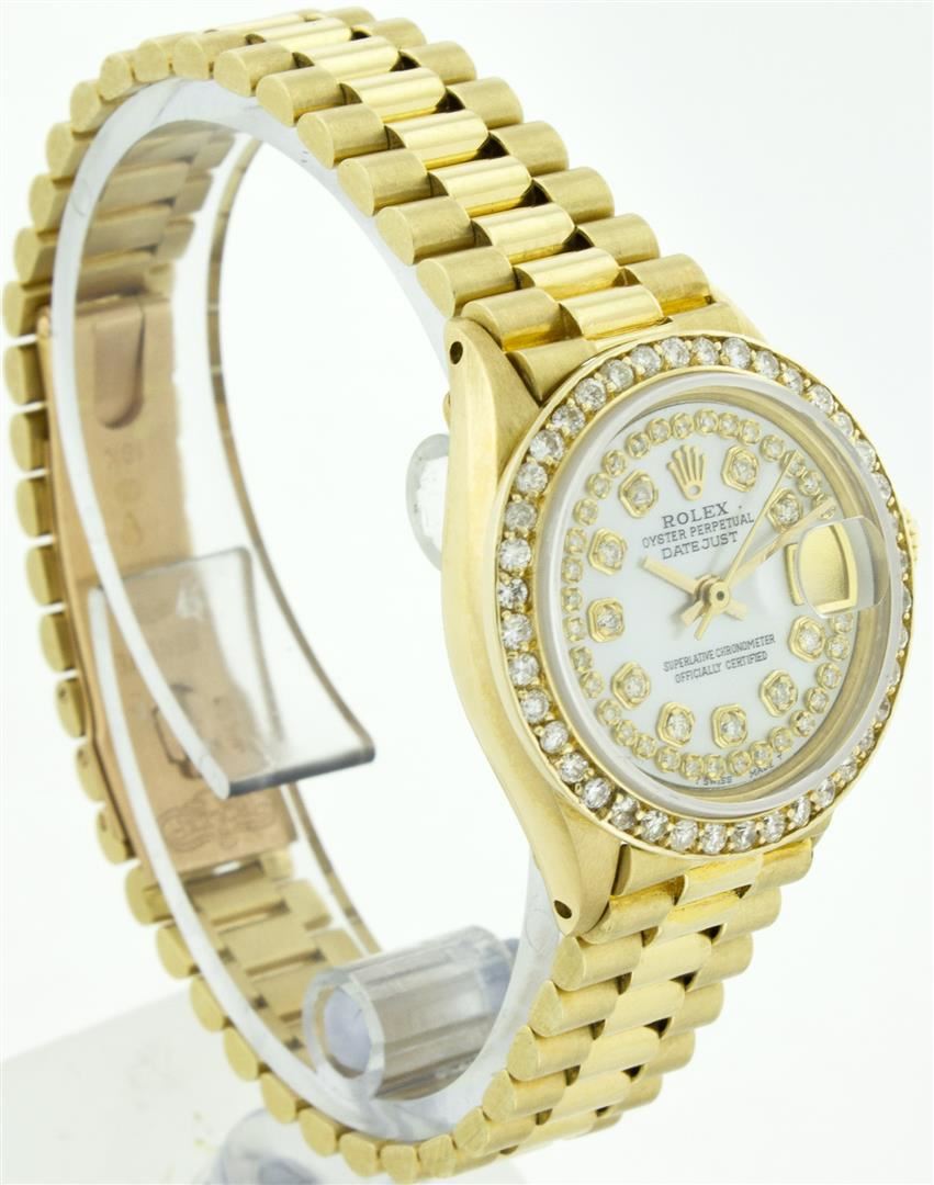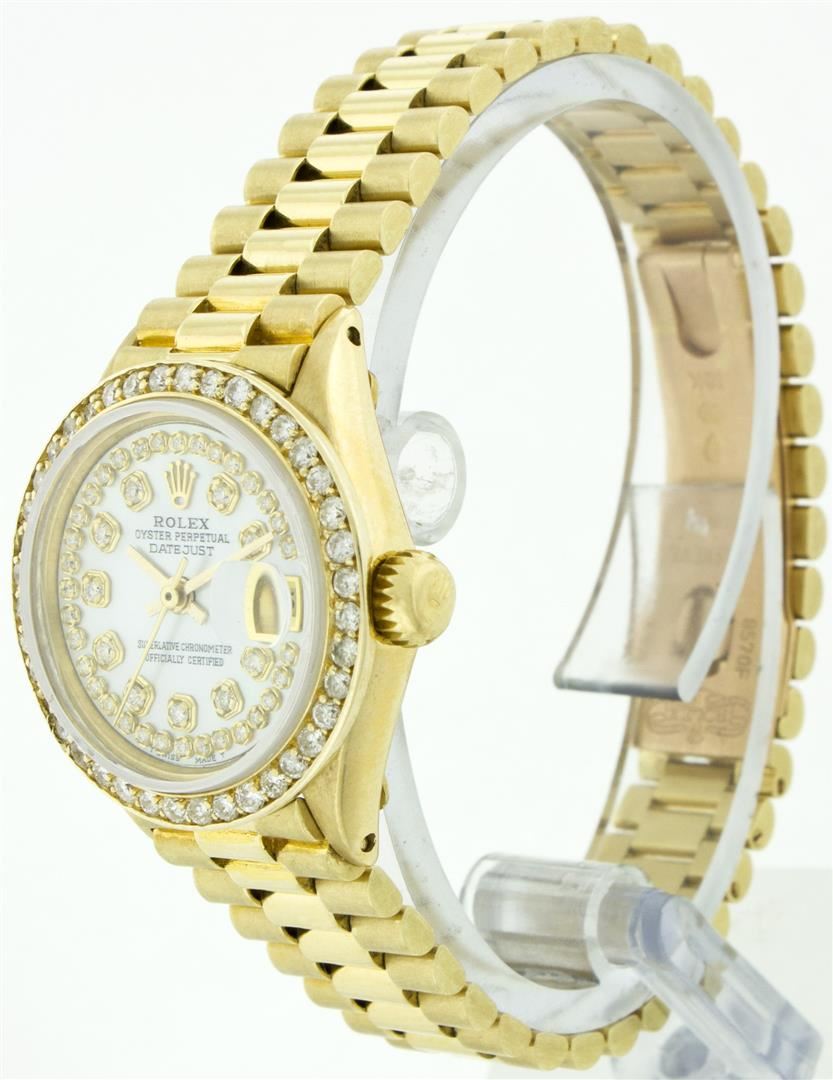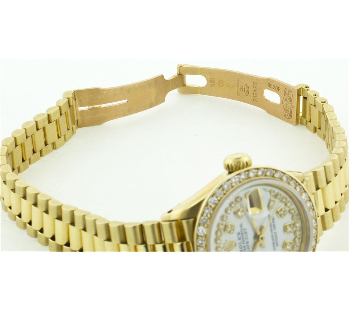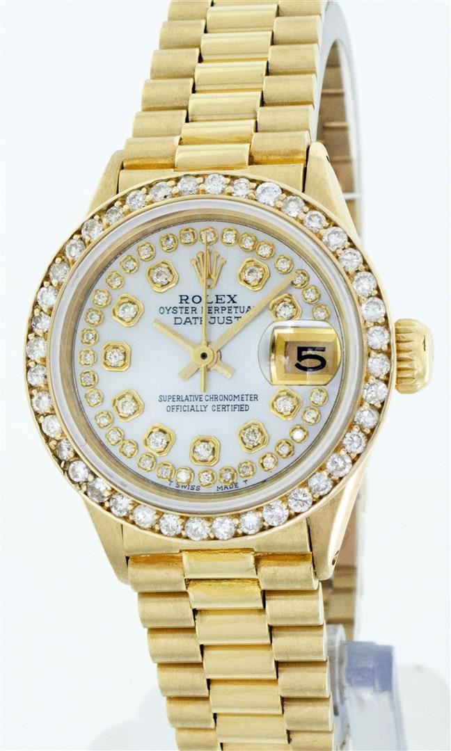 One Ladies Rolex President Polished, Serviced & Electronically Tested, Yellow Gold Case: 26mm, Yellow Gold Crown, Custom Bezel: 18K Yellow Gold Bead Set Diamond Bezel, Diamond Count: 32 Diamonds Total Weight .70 Carat, Clarity: SI-VS, Color: G to H. Custom Crystal: Synthetic Sapphire Cyclops Lens. Movement: Automatic Winding Movement Caliber 2030. Dial: Mother Of Pearl With String Diamond Dial, Color: G to H, Diamond Count: 43 Diamonds In Dial, Clarity: SI-VS. Date Window: 3 O'Clock Position, Quickset, Model: 6917 Condition: G-6 Extra Fine. Bracelet: Yellow Gold President, Bright & Satin Polish. 5.5 Inch Length, Standard President Clasp (Hidden Clasp), With Rolex Logo.