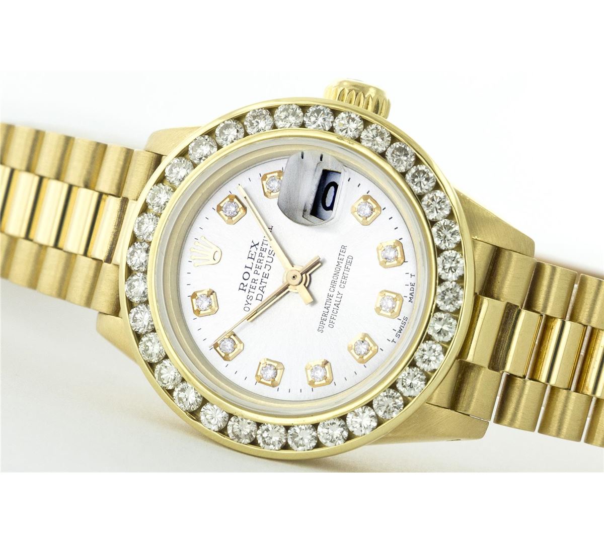 One Ladies Rolex President Polished, Serviced & Electronically Tested, Yellow Gold Case: 26mm, Yellow Gold Crown, Custom Bezel: 18K Yellow Gold Bead Set Diamond Bezel, Diamond Count: 32 Diamonds Total Weight .70 Carat, Clarity: SI-VS, Color: G to H. Custom Crystal: Synthetic Sapphire Cyclops Lens. Movement: Automatic Winding Movement Caliber 2030. Dial: Mother Of Pearl With String Diamond Dial, Color: G to H, Diamond Count: 43 Diamonds In Dial, Clarity: SI-VS. Date Window: 3 O'Clock Position, Model: 6917 Condition: G-6 Extra Fine. Bracelet: Yellow Gold President, Bright & Satin Polish. 5.5 Inch Length, Standard President Clasp (Hidden Clasp), With Rolex Logo.