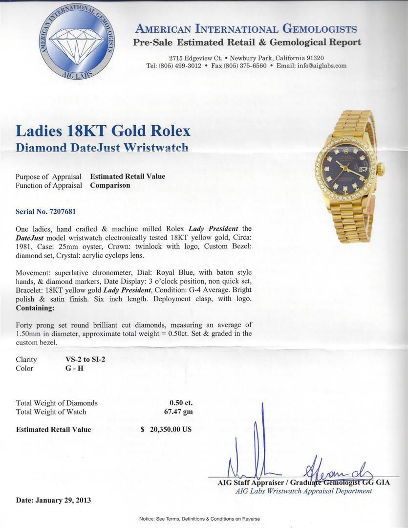 One ladies, hand crafted & machine milled Rolex Lady President the DateJust model wristwatch electronically tested 18KT yellow gold, Circa: 1981, Case: 25mm oyster, Crown: twinlock with logo, Custom Bezel: diamond set, Crystal: acrylic cyclops lens. Movement: superlative chronometer. Dial: Royal Blue, with baton style hands, & diamond markers, Date Display: 3 o'clock position, non quick set, Bracelet: 18KT yellow gold Lady President, Condition: G-4 Average. Bright polish & satin finish. Six inch length. Deployment clasp, with logo. Containing: Forty prong set round brilliant cut diamonds, measuring an average of 1.50mm in diameter, approximate total weight = 0.50ct. Set & graded in the custom bezel. Clarity VS-2 to SI-2. Color: G - H. Total Weight of Diamonds 0.50ct. Total Weight of Watch 67.47 grams. AIG Appraised at $20,350.00.