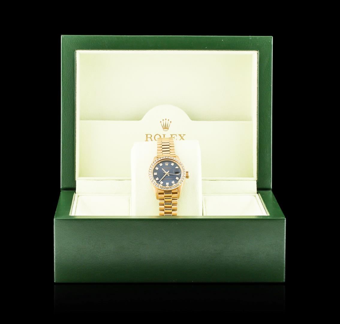One ladies, hand crafted & machine milled Rolex Lady President the DateJust model wristwatch electronically tested 18KT yellow gold, Circa: 1981, Case: 25mm oyster, Crown: twinlock with logo, Custom Bezel: diamond set, Crystal: acrylic cyclops lens. Movement: superlative chronometer. Dial: Royal Blue, with baton style hands, & diamond markers, Date Display: 3 o'clock position, non quick set, Bracelet: 18KT yellow gold Lady President, Condition: G-4 Average. Bright polish & satin finish. Six inch length. Deployment clasp, with logo. Containing: Forty prong set round brilliant cut diamonds, measuring an average of 1.50mm in diameter, approximate total weight = 0.50ct. Set & graded in the custom bezel. Clarity VS-2 to SI-2. Color: G - H. Total Weight of Diamonds 0.50ct. Total Weight of Watch 67.47 grams. AIG Appraised at $20,350.00.
