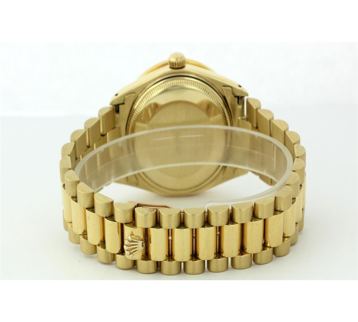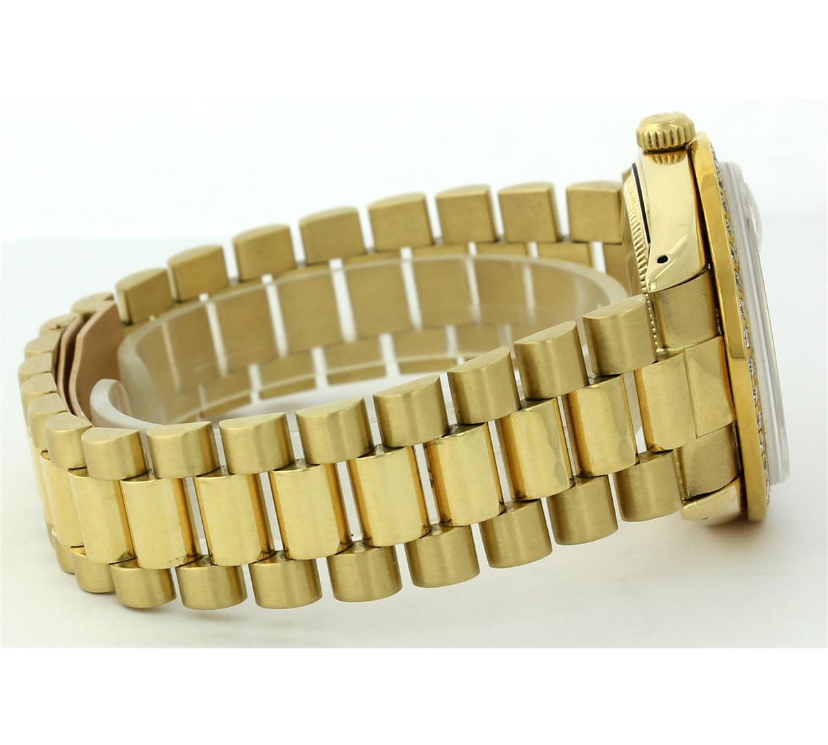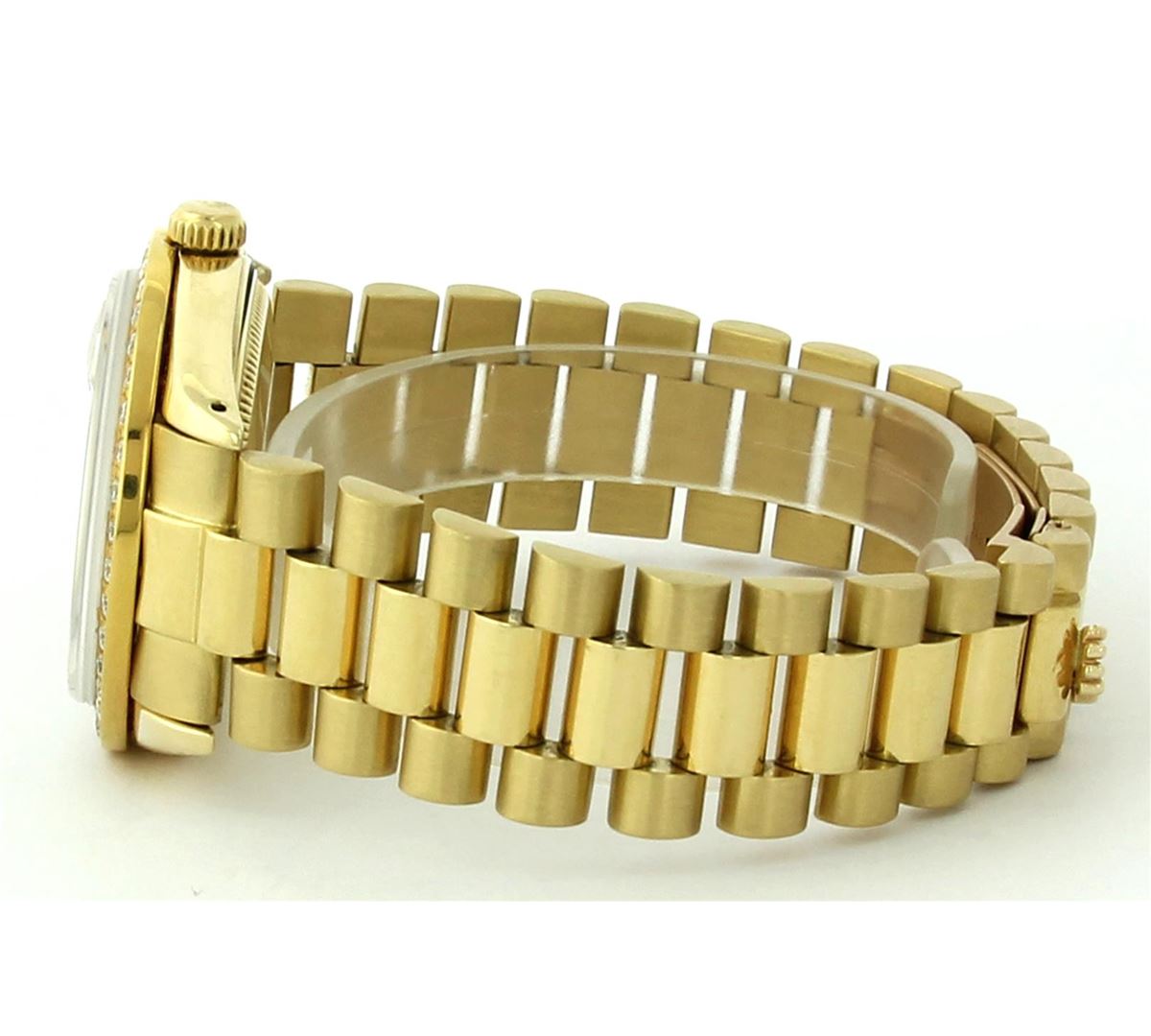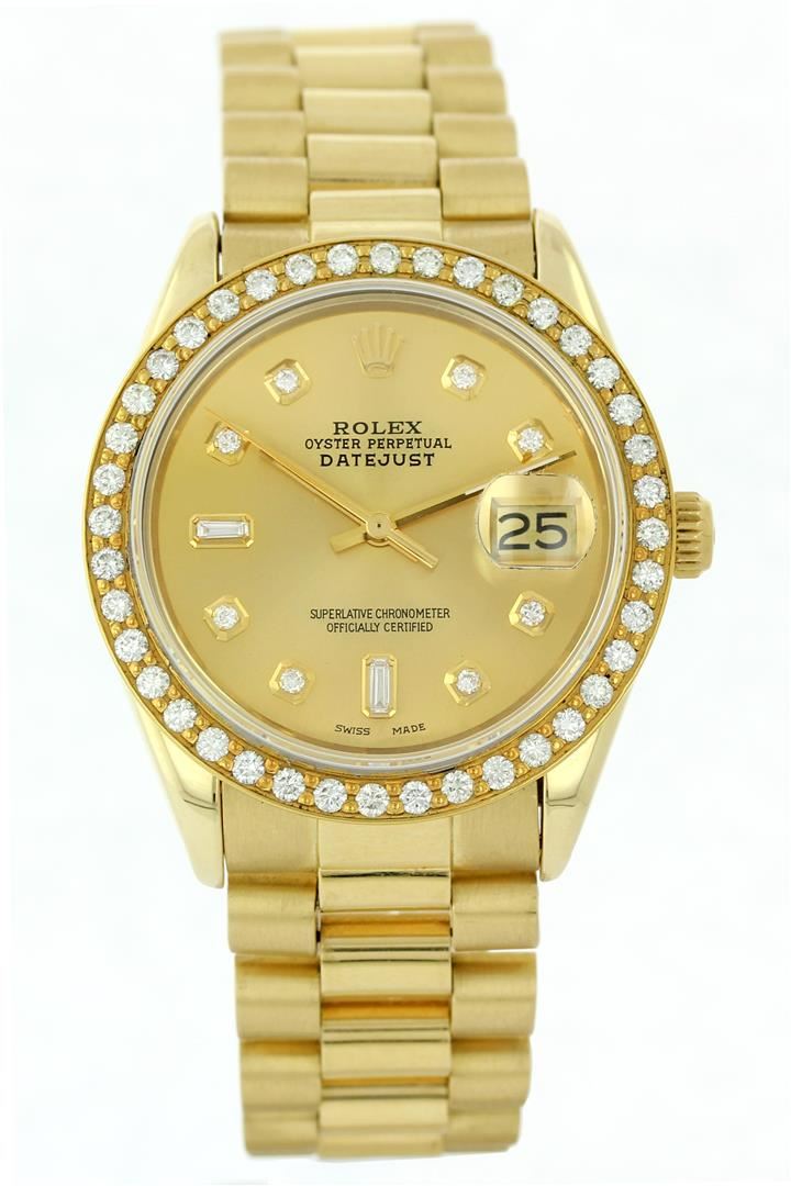 One Gents Rolex Datejust President Polished, Serviced & Electronically Tested, Yellow Gold Case:36mm, Yellow Gold Crown, Custom Bezel: 18K Yellow Gold Beadset Diamond Bezel, Diamond Count: 44 Diamonds Total Weight 1.00 Carat, Clarity: SI-VS, Color: G to H. Custom Crystal: Synthetic Sapphire Cyclops Lens. Movement: Automatic Winding Movement Caliber 1565. Custom Dial: Champagne With Diamond Hour Markers, (8 Diamond In Dial + 2 Baguette Diamonds In Dial) G To H In Color, Clarity: SI-VS. Date Window: 3 O'Clock Position Date Display. Model: 1503 Condition: G-6 Extra Fine. Bracelet: Custom Yellow Gold President. Bright Polish. 6.5 Inch Length, Standard President Clasp.