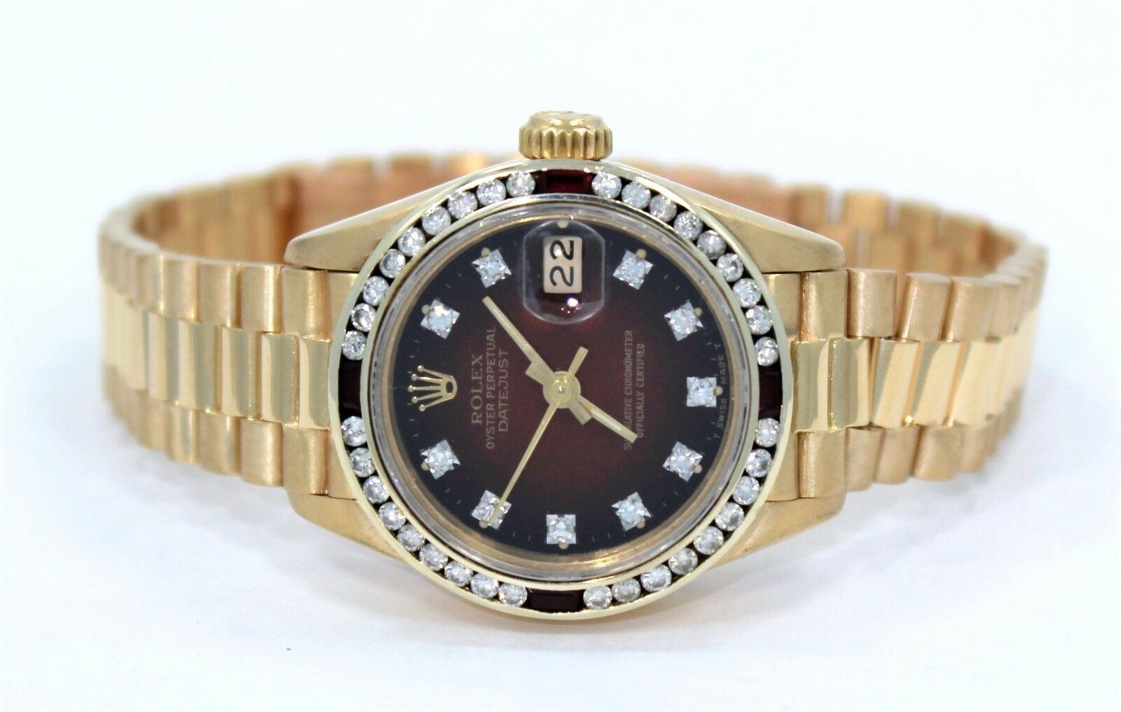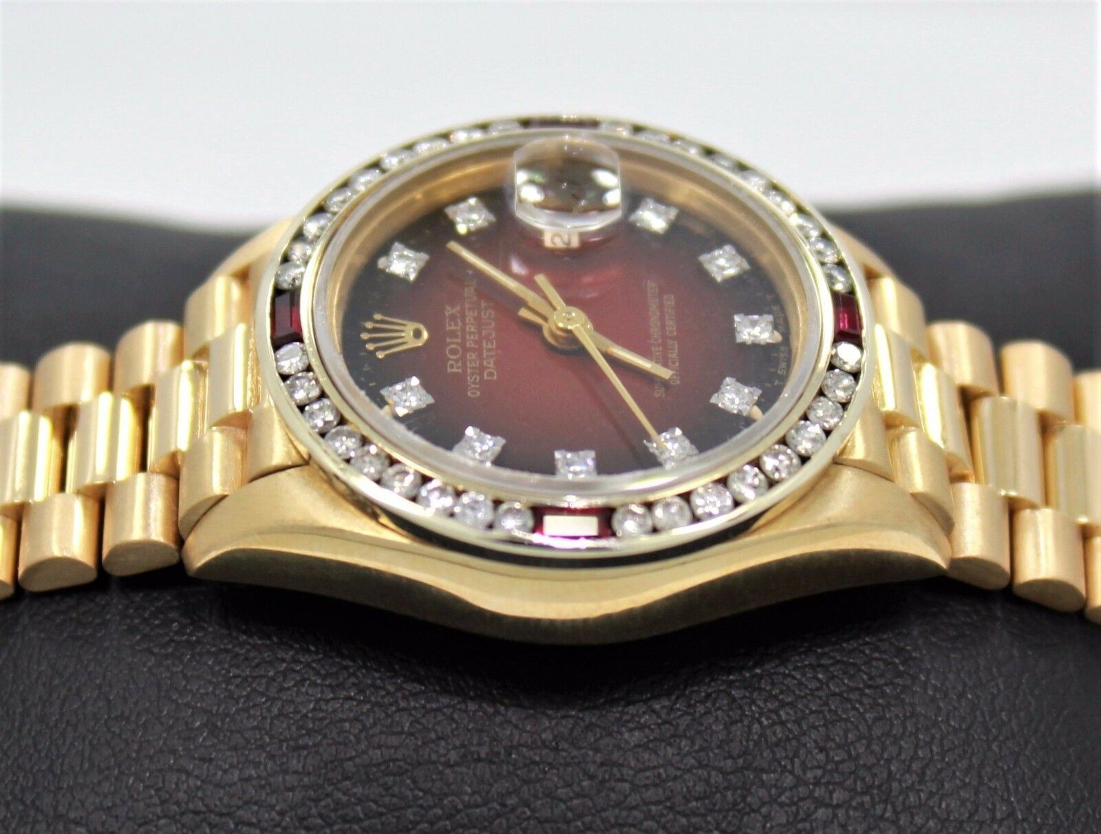 Model: Ladies Rolex President 69178 Datejust 18K Yellow Gold 1.05CT Diamond Ruby Bezel Watch