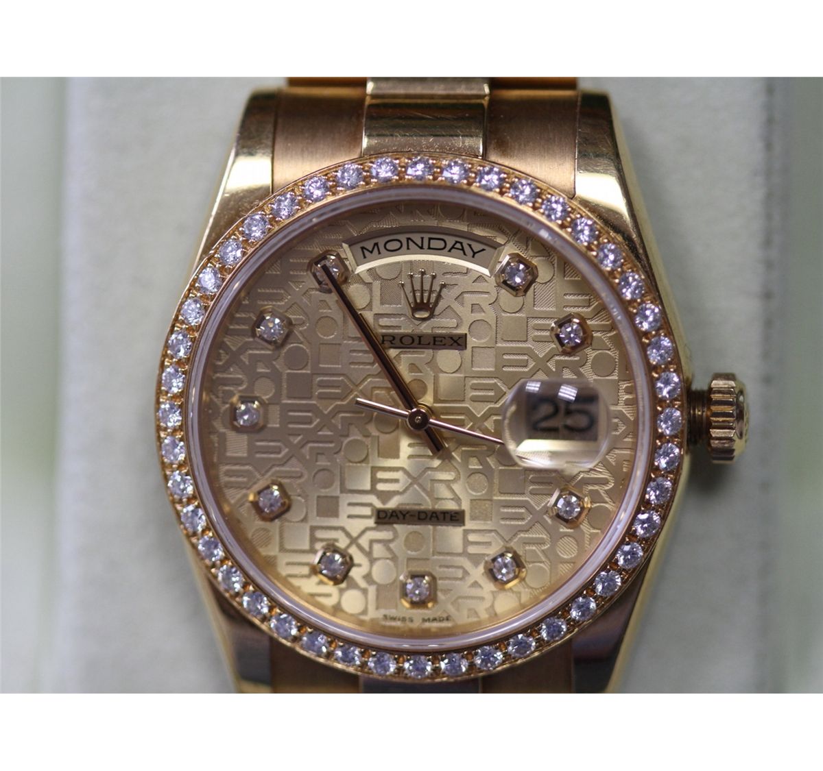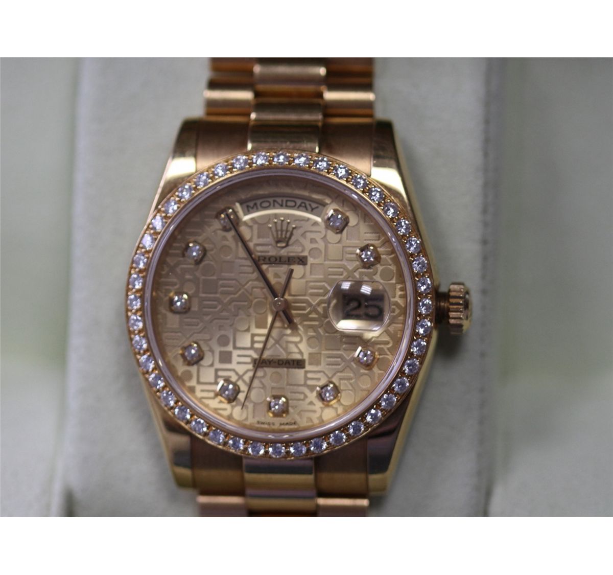 Rolex President Day Date Champagne Jubilee Diamond Dial Factory and Diamond Bezel out of factory DEVVS About 3.00ct, We guarantee you that the timepieces we sell are all authentic, unless otherwise stated where there are custom diamond parts such as diamond dial, diamond bezel, and/or diamond band. We do not sell replicas of any kind.