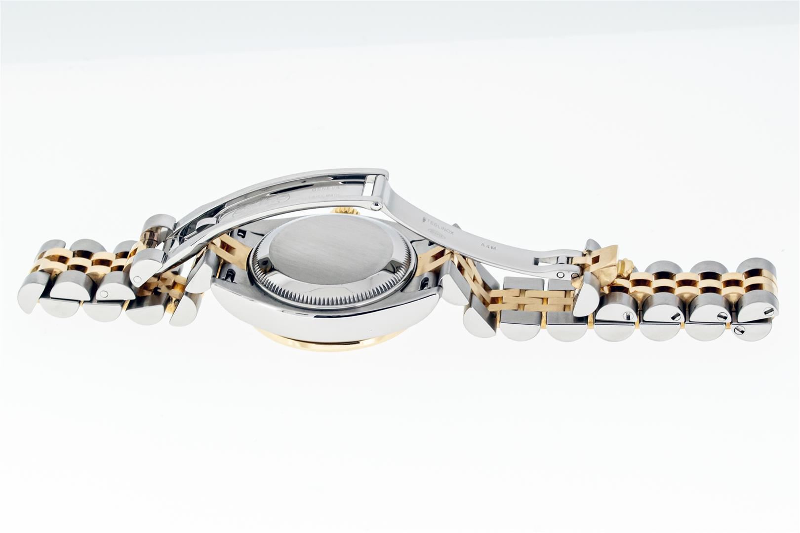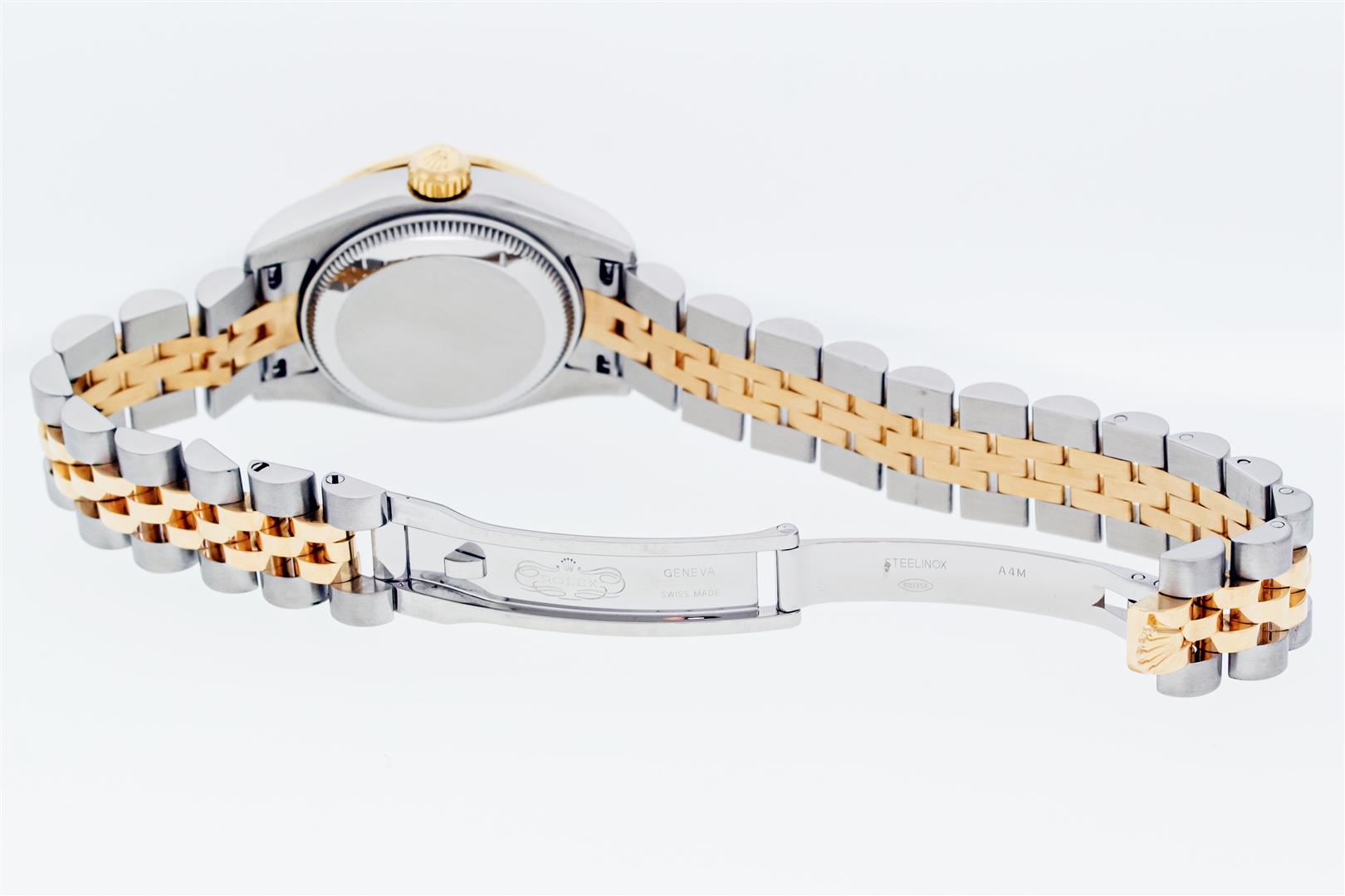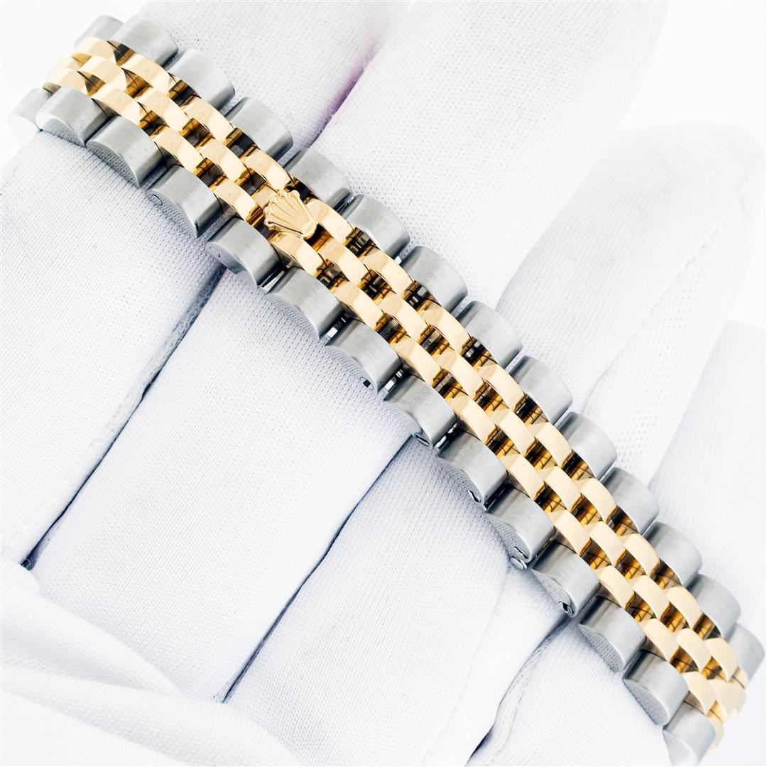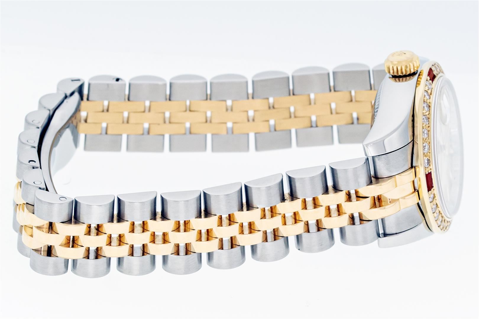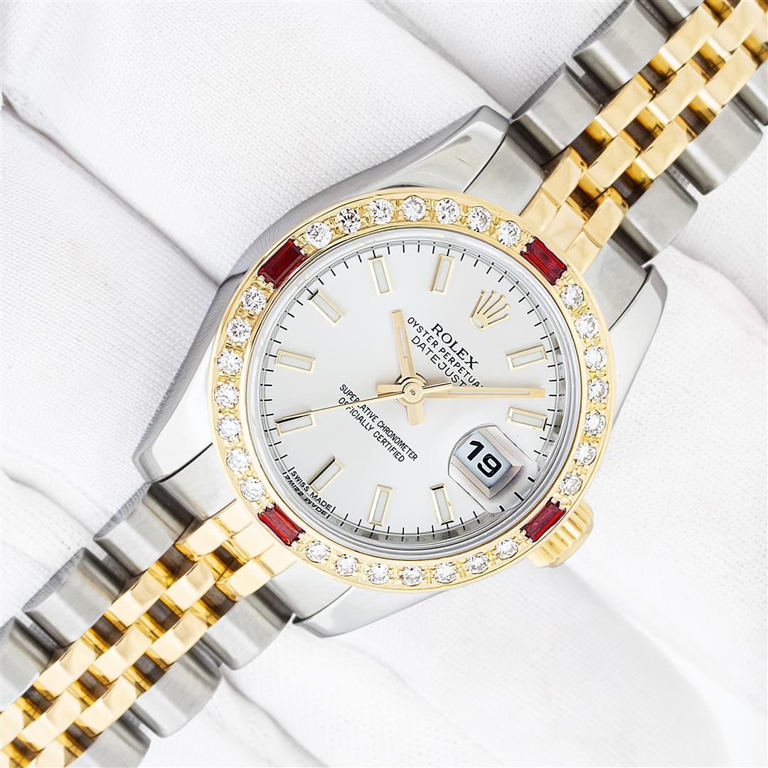 One Ladies Pre Owned Quickset Sapphire 2T 18K Yellow Gold & Stainless Steel Rolex Datejust Polished Bright with Satin Finish, Serviced & Electronically Tested, Rolex Stainless Steel Case: 26mm, Rolex 18K Yellow Gold Crown, Custom Bezel: New 18K Yellow Gold Ruby Beadset Diamond Bezel, Stone Count: 28 Diamonds + 4 Rubies, Diamond Color: G To H, Clarity: SI-VS. Crystal: Sapphire With Magnified Date Window. Hands: Luminescent Hands. Rolex Movement: Automatic Winding Movement 2235. Rolex Dial: Silver Index With Dash Track. Date Window: 3 O'Clock Position Date Display, Model: Sapphire Quickset Datejust. Condition: G-6 Extra Fine. Rolex Bracelet: 18K Yellow Gold & Stainless Steel Jubilee Band. Bright Polish & Satin Finish. 6.0 Inch Length, Adjustable. Hidden Clap, With Rolex Logo. This Watch Has Been Serviced Time Tested And Is In Excellent Condition It Is Free Of All Scratches And Dents.
