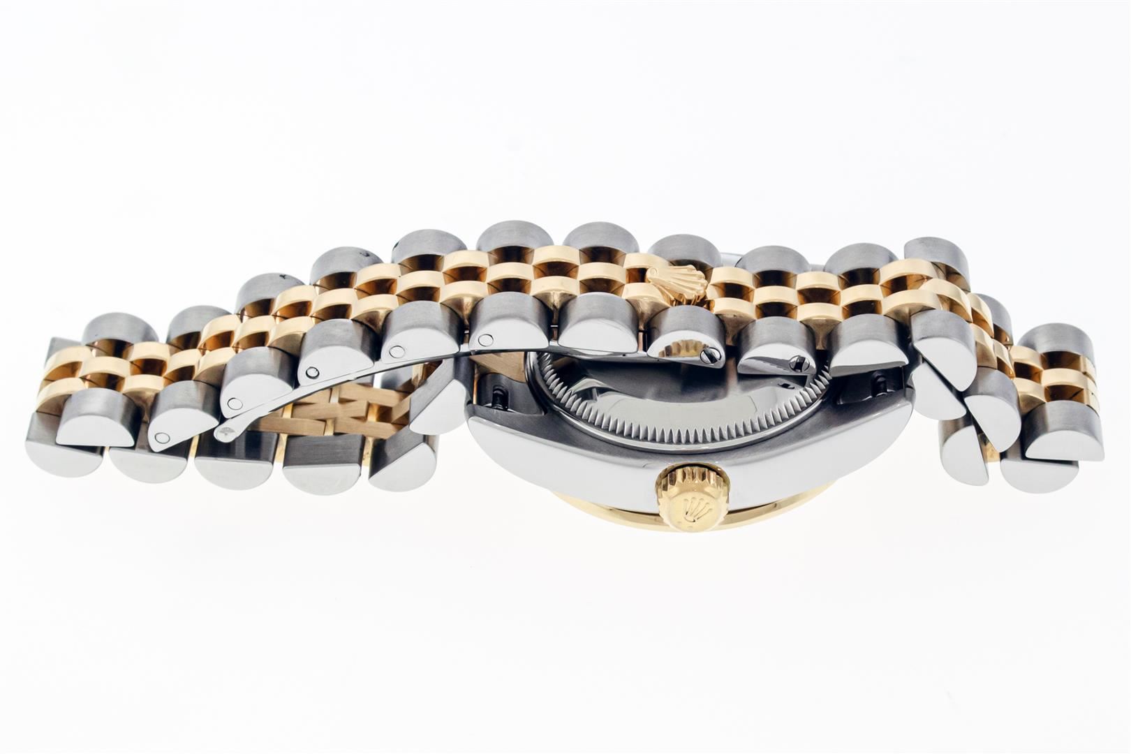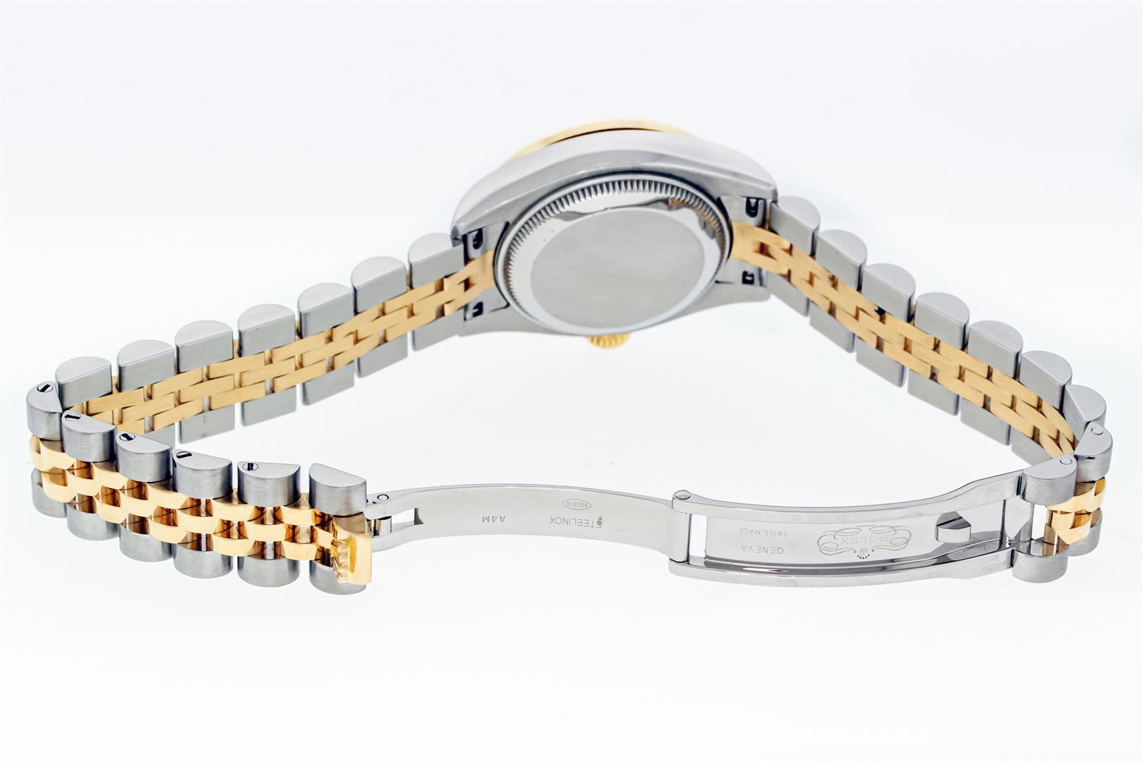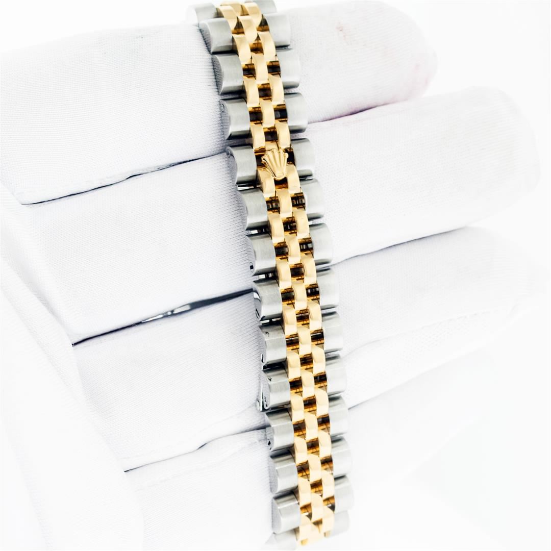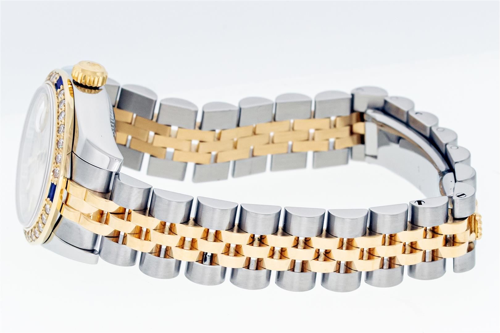 One Ladies Pre Owned Quickset Sapphire 2T 18K Yellow Gold & Stainless Steel Rolex Datejust Polished Bright with Satin Finish, Serviced & Electronically Tested, Rolex Stainless Steel Case: 26mm, Rolex 18K Yellow Gold Crown, Custom Bezel: New 18K Yellow Gold Sapphire Beadset Diamond Bezel, Stone Count: 28 Diamonds + 4 Sapphires, Diamond Color: G To H, Clarity: SI-VS. Crystal: Sapphire With Magnified Date Window. Hands: Luminescent Hands. Rolex Movement: Automatic Winding Movement 2235. Rolex Dial: Silver Index With Dash Track. Date Window: 3 O'Clock Position Date Display, Model: Sapphire Quickset Datejust. Condition: G-6 Extra Fine. Rolex Bracelet: 18K Yellow Gold & Stainless Steel Jubilee Band. Bright Polish & Satin Finish. 6.0 Inch Length, Adjustable. Hidden Clap, With Rolex Logo. This Watch Has Been Serviced Time Tested And Is In Excellent Condition It Is Free Of All Scratches And Dents.