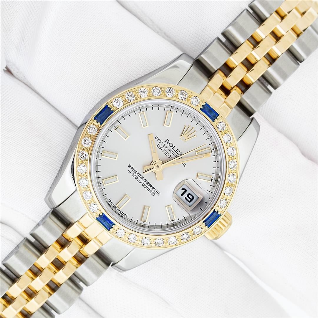 One Ladies Pre Owned Quickset Sapphire 2T 18K Yellow Gold & Stainless Steel Rolex Datejust Polished Bright with Satin Finish, Serviced & Electronically Tested, Rolex Stainless Steel Case: 26mm, Rolex 18K Yellow Gold Crown, Custom Bezel: New 18K Yellow Gold Sapphire Beadset Diamond Bezel, Stone Count: 28 Diamonds + 4 Sapphires, Diamond Color: G To H, Clarity: SI-VS. Crystal: Sapphire With Magnified Date Window. Hands: Luminescent Hands. Rolex Movement: Automatic Winding Movement 2235. Rolex Dial: Silver Index With Dash Track. Date Window: 3 O'Clock Position Date Display, Model: Sapphire Quickset Datejust. Condition: G-6 Extra Fine. Rolex Bracelet: 18K Yellow Gold & Stainless Steel Jubilee Band. Bright Polish & Satin Finish. 6.0 Inch Length, Adjustable. Hidden Clap, With Rolex Logo. This Watch Has Been Serviced Time Tested And Is In Excellent Condition It Is Free Of All Scratches And Dents.