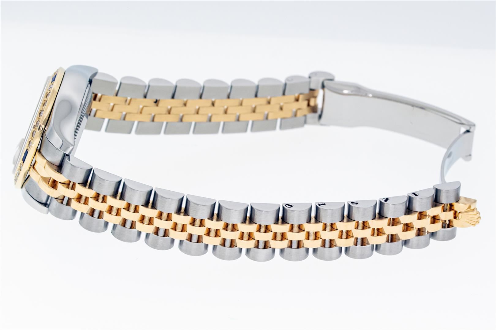 One Ladies Pre Owned Quickset Sapphire 2T 18K Yellow Gold & Stainless Steel Rolex Datejust Polished Bright with Satin Finish, Serviced & Electronically Tested, Rolex Stainless Steel Case: 26mm, Rolex 18K Yellow Gold Crown, Custom Bezel: New 18K Yellow Gold Sapphire Beadset Diamond Bezel, Stone Count: 28 Diamonds + 4 Sapphires, Diamond Color: G To H, Clarity: SI-VS. Crystal: Sapphire With Magnified Date Window. Hands: Luminescent Hands. Rolex Movement: Automatic Winding Movement 2235. Rolex Dial: Silver Index With Dash Track. Date Window: 3 O'Clock Position Date Display, Model: Sapphire Quickset Datejust. Condition: G-6 Extra Fine. Rolex Bracelet: 18K Yellow Gold & Stainless Steel Jubilee Band. Bright Polish & Satin Finish. 6.0 Inch Length, Adjustable. Hidden Clap, With Rolex Logo. This Watch Has Been Serviced Time Tested And Is In Excellent Condition It Is Free Of All Scratches And Dents.