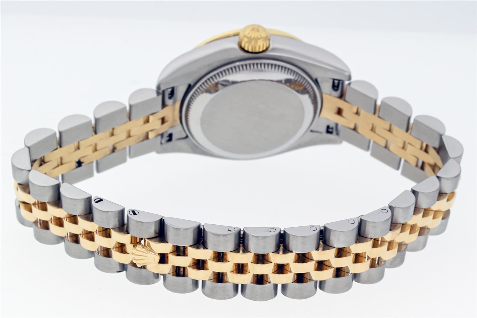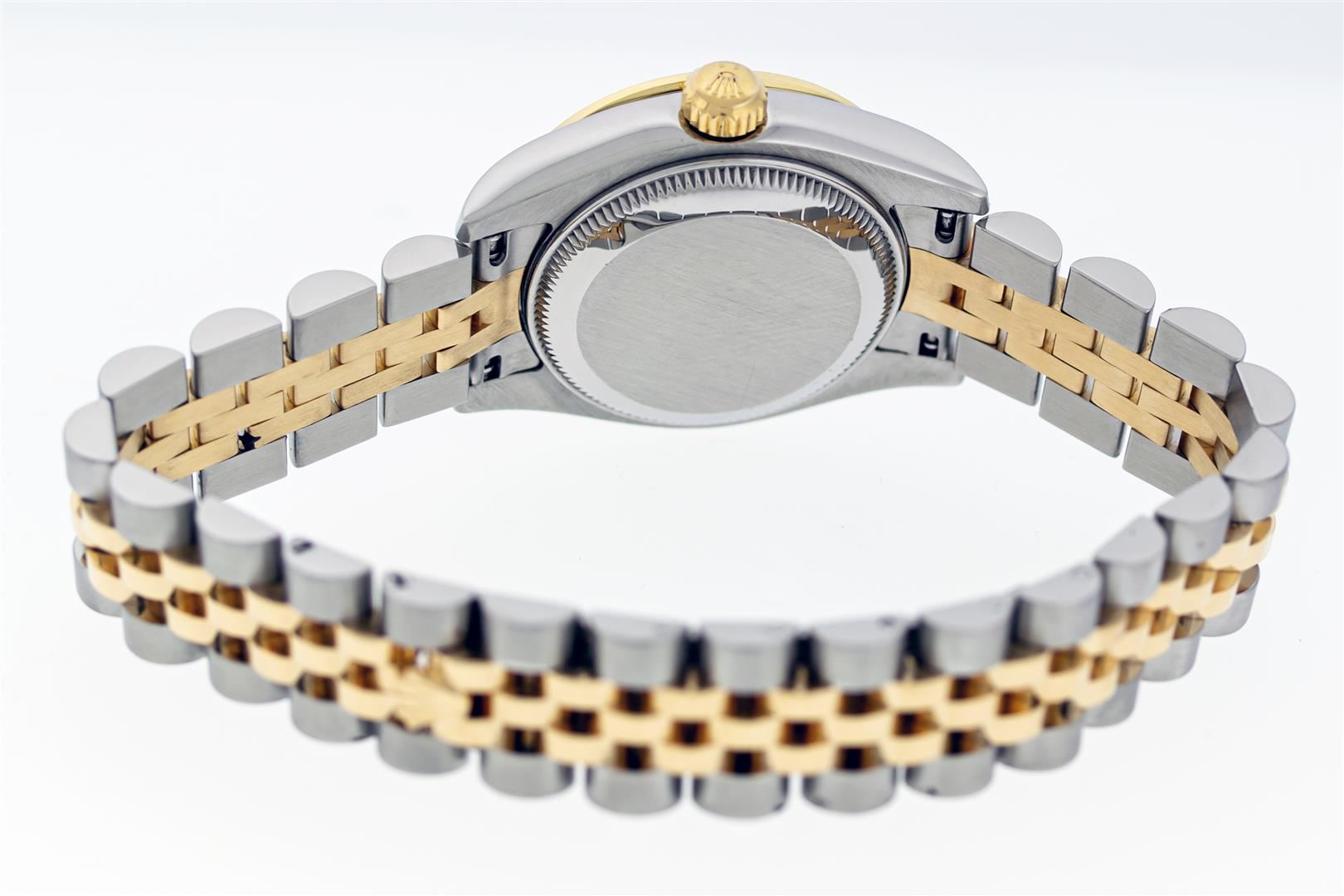 One Ladies Pre Owned Quickset Sapphire 2T 18K Yellow Gold & Stainless Steel Rolex Datejust Polished Bright with Satin Finish, Serviced & Electronically Tested, Rolex Stainless Steel Case: 26mm, Rolex 18K Yellow Gold Crown, Custom Bezel: New 18K Yellow Gold Beadset Diamond Bezel, Diamond Count: 32 Diamonds On Bezel, Diamond Color: G To H, Clarity: SI-VS. Crystal: Sapphire With Magnified Date Window. Hands: Luminescent Hands. Rolex Movement: Automatic Winding Movement 2235. Rolex Dial: Silver Index With Dash Track. Date Window: 3 O'Clock Position Date Display, Model: Sapphire Quickset Datejust. Condition: G-6 Extra Fine. Rolex Bracelet: 18K Yellow Gold & Stainless Steel Jubilee Band. Bright Polish & Satin Finish. 6.0 Inch Length, Adjustable. Hidden Clap, With Rolex Logo. This Watch Has Been Serviced Time Tested And Is In Excellent Condition It Is Free Of All Scratches And Dents.